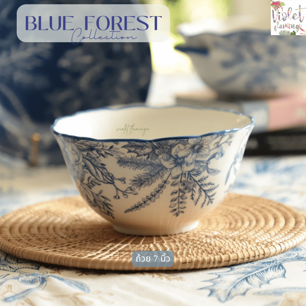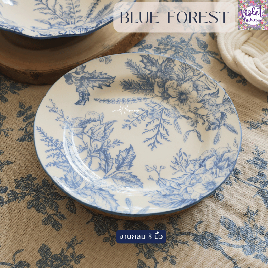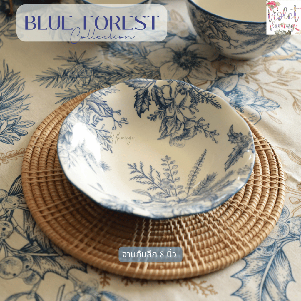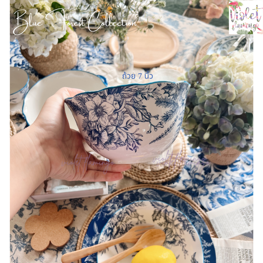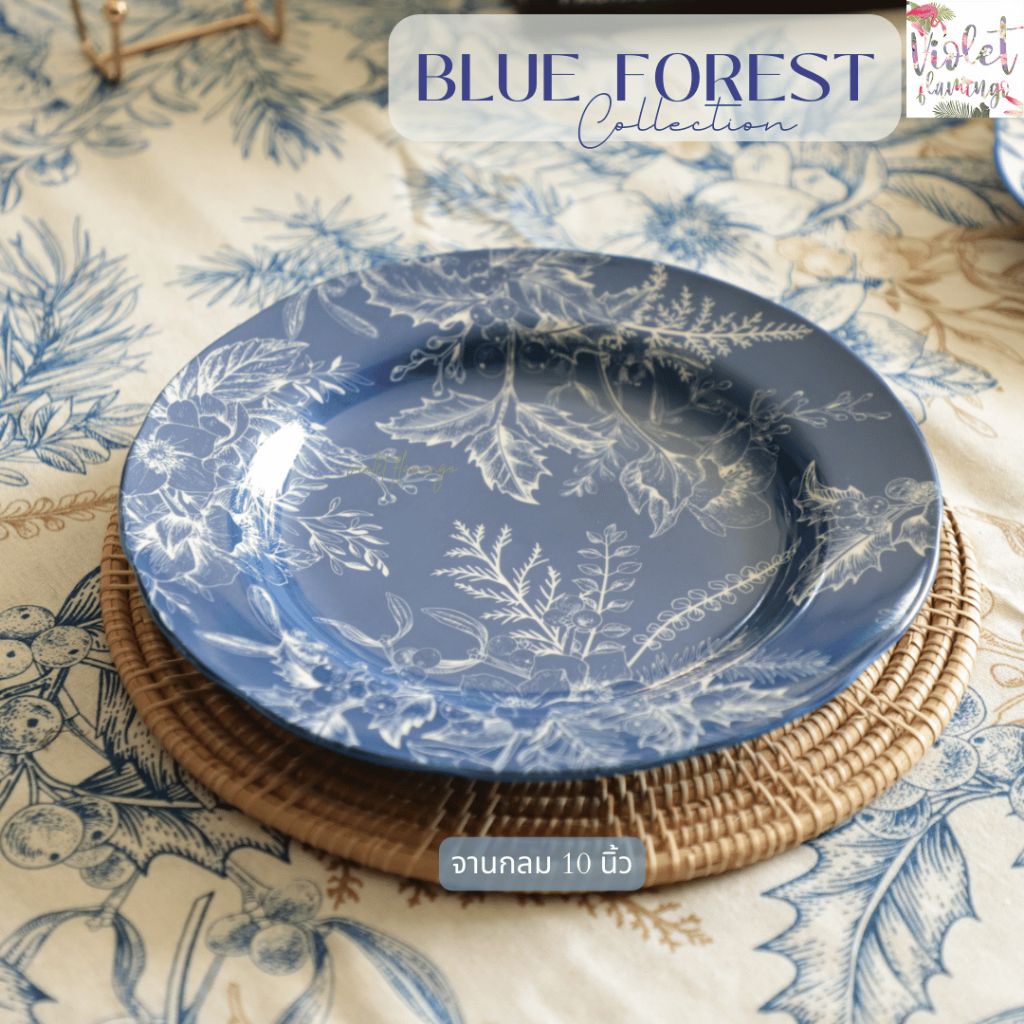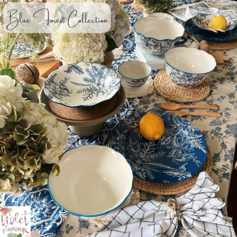 Violet Flamingo ชุดจานชามเซรามิค รุ่น Blue Forest จานสีน้ำเงินลายดอกไม้ต้นไม้ เข้าไมโครเวฟได้