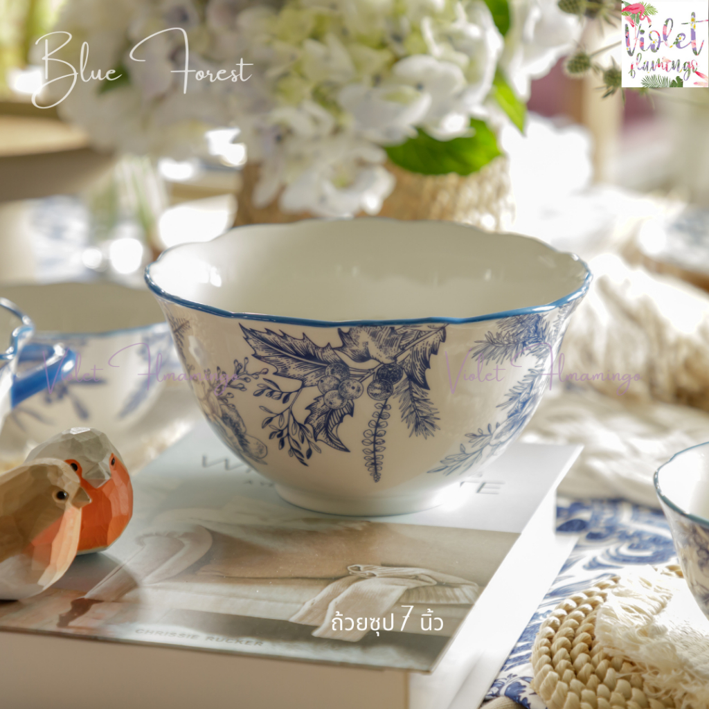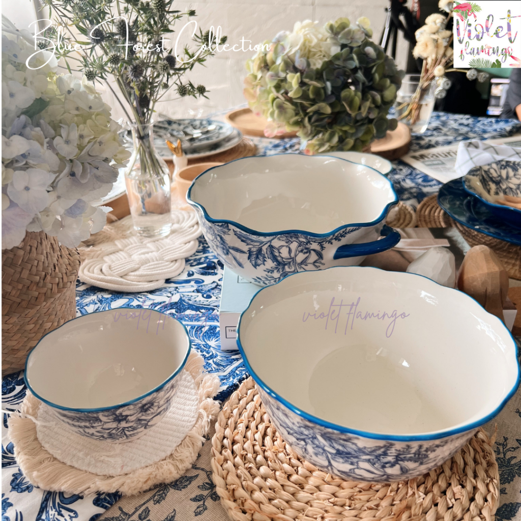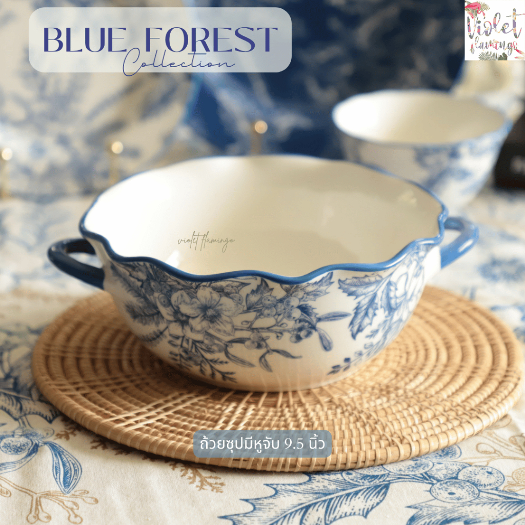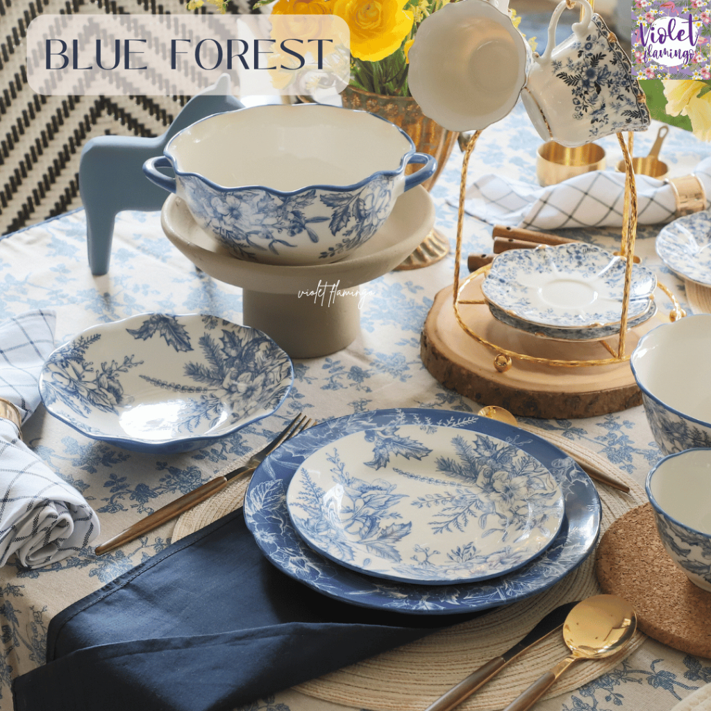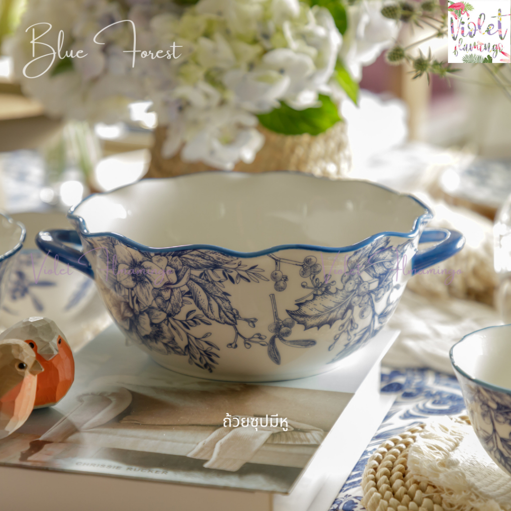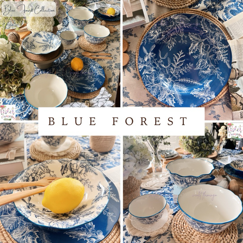 Violet Flamingo ชุดจานชามเซรามิค รุ่น Blue Forest จานสีน้ำเงินลายดอกไม้ต้นไม้ เข้าไมโครเวฟได้