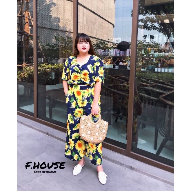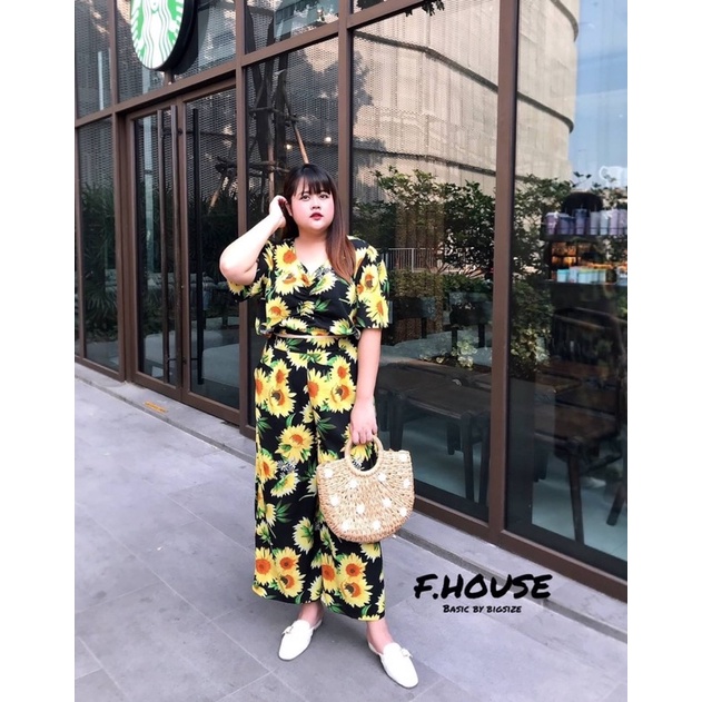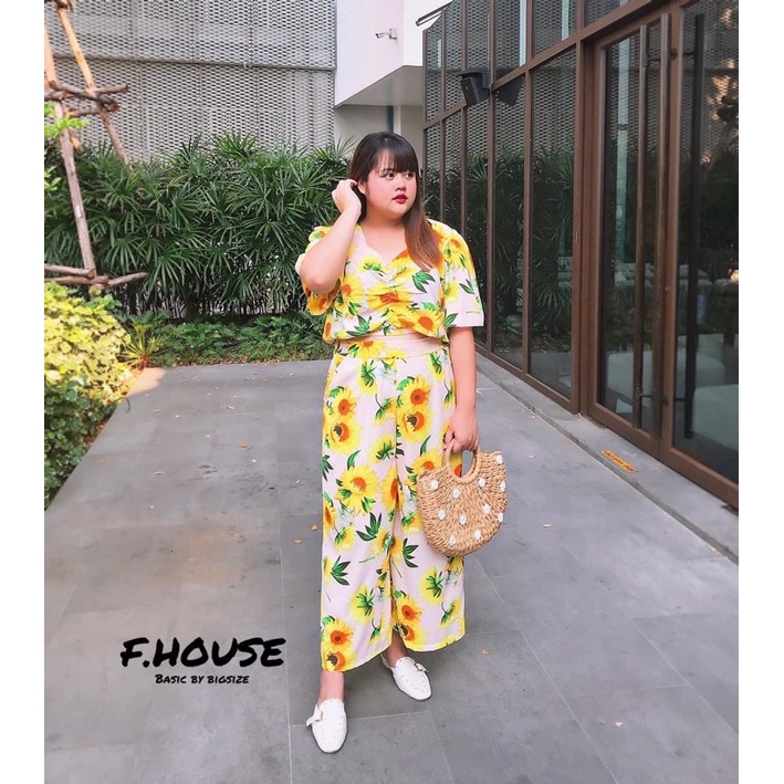 เซ็ต เสื้อเย็บย่นหน้า + กางเกงขายาวลายดอกทานตะวัน