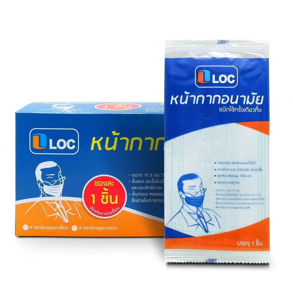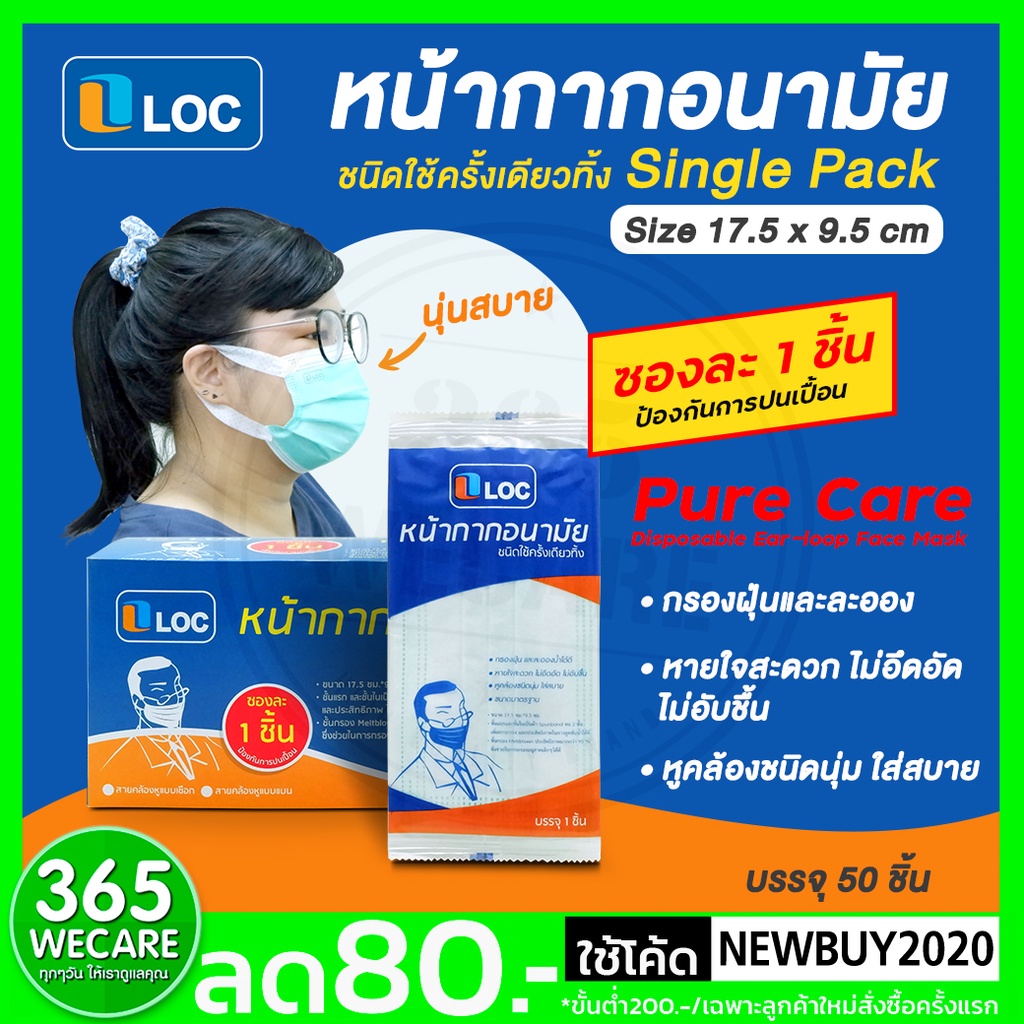 หน้ากากอนามัย LOC Pure Care หน้ากาก50ชิ้น สายคล้องแบน 365wecare