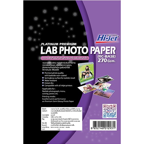 Hi-jet กระดาษโฟโต้ ผิวกึ่งมันกึ่งด้าน Inkjet Platinum Lab (Backside-coated) 270 แกรม 4x6 นิ้ว 100 แผ่น