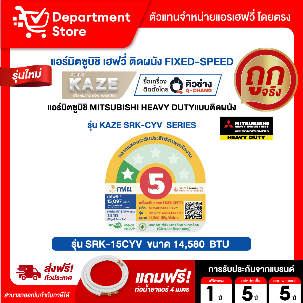 แอร์ MITSUBISHI HEAVY DUTY ติดผนัง FIXED-SPEED ประหยัดไฟ เบอร์ 5 รุ่น KAZE SRK-CYV SERIES + แถมท่อน้ำยาแอร์ 4 เมตร