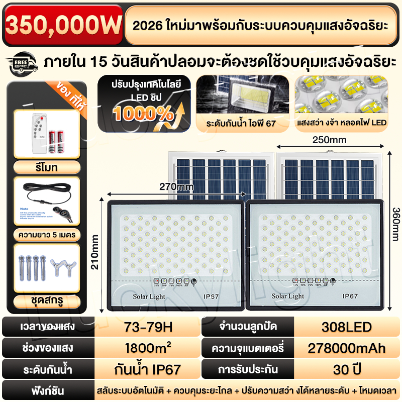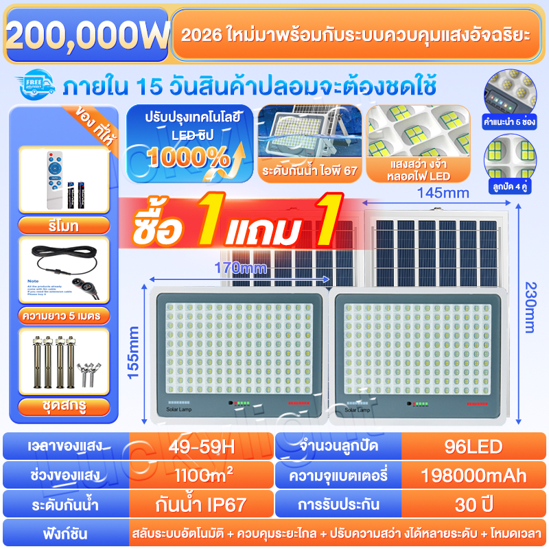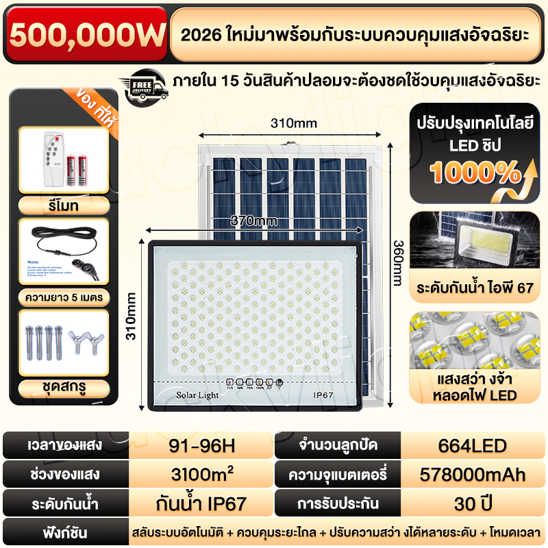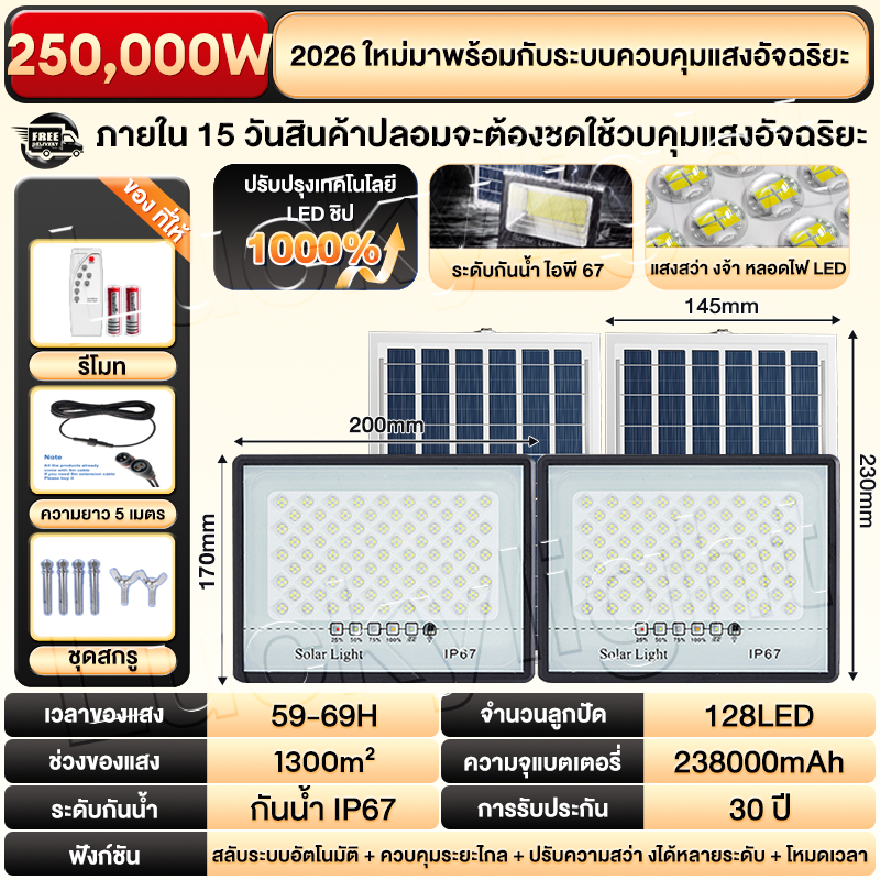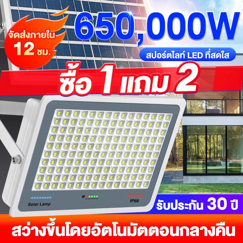 ซื้อ 1 แถม 1 ไฟโซล่าเซลล์ ไฟโซล่าเซล IP69กันน้ำ กันฟ้าผ่า650,000W โซลาร์เซลล์ Solar Light ไฟโซลาเซลล์ เซ็นเซอร์ พร้อมรีโ