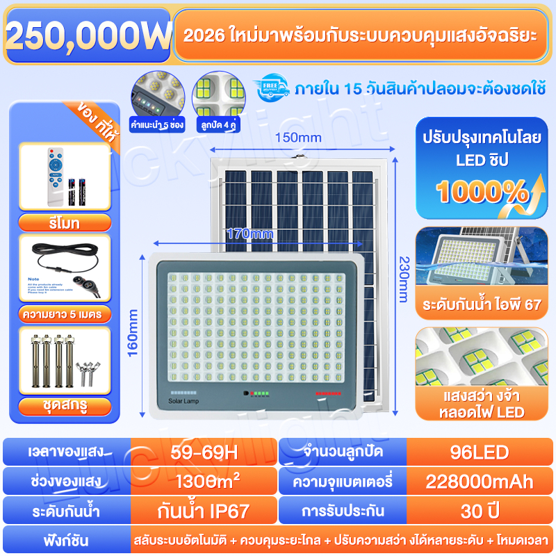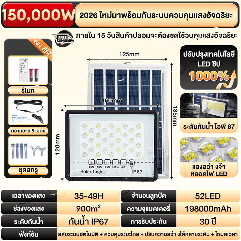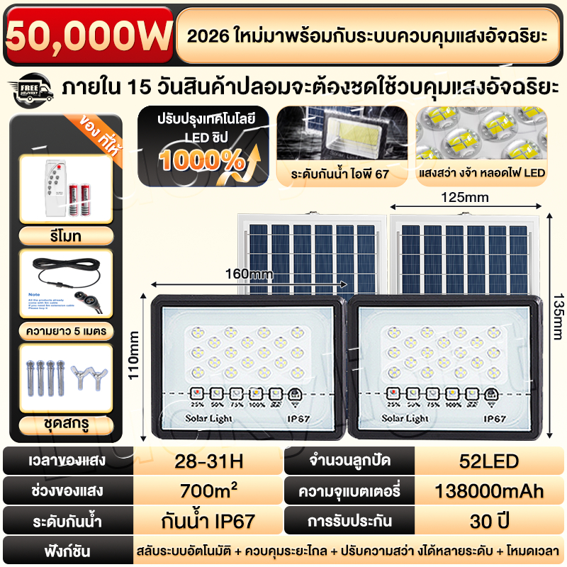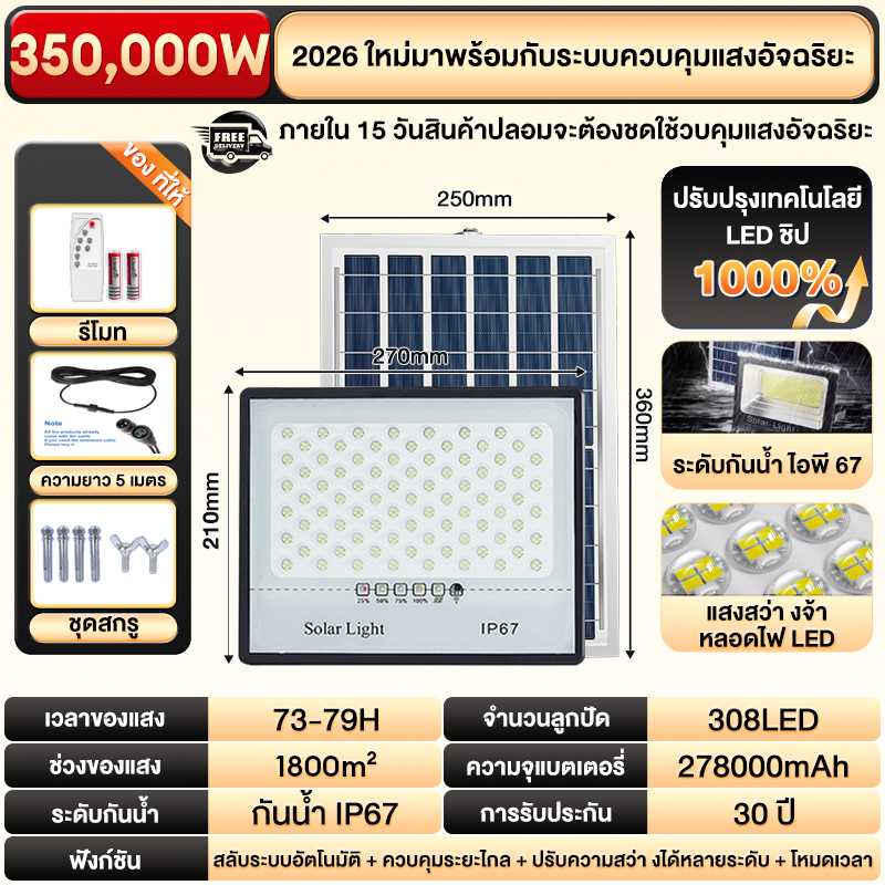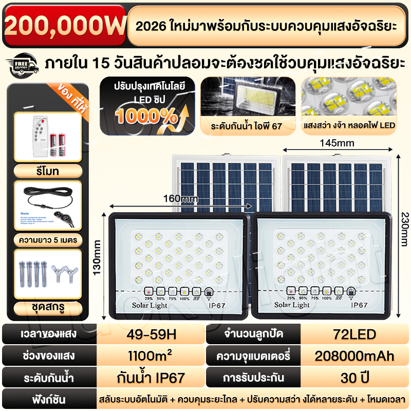 ซื้อ 1 แถม 1 ไฟโซล่าเซลล์ ไฟโซล่าเซล IP69กันน้ำ กันฟ้าผ่า650,000W โซลาร์เซลล์ Solar Light ไฟโซลาเซลล์ เซ็นเซอร์ พร้อมรีโ