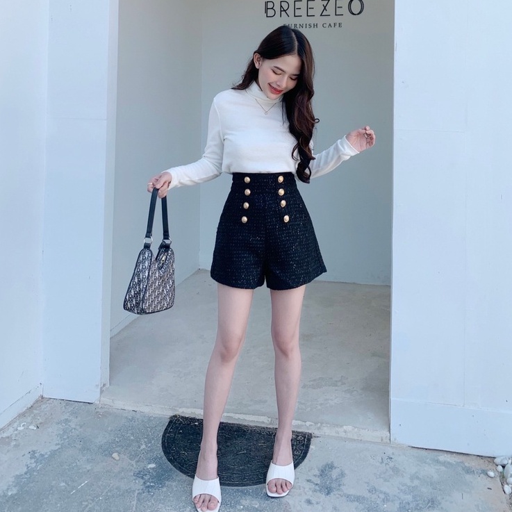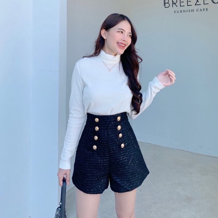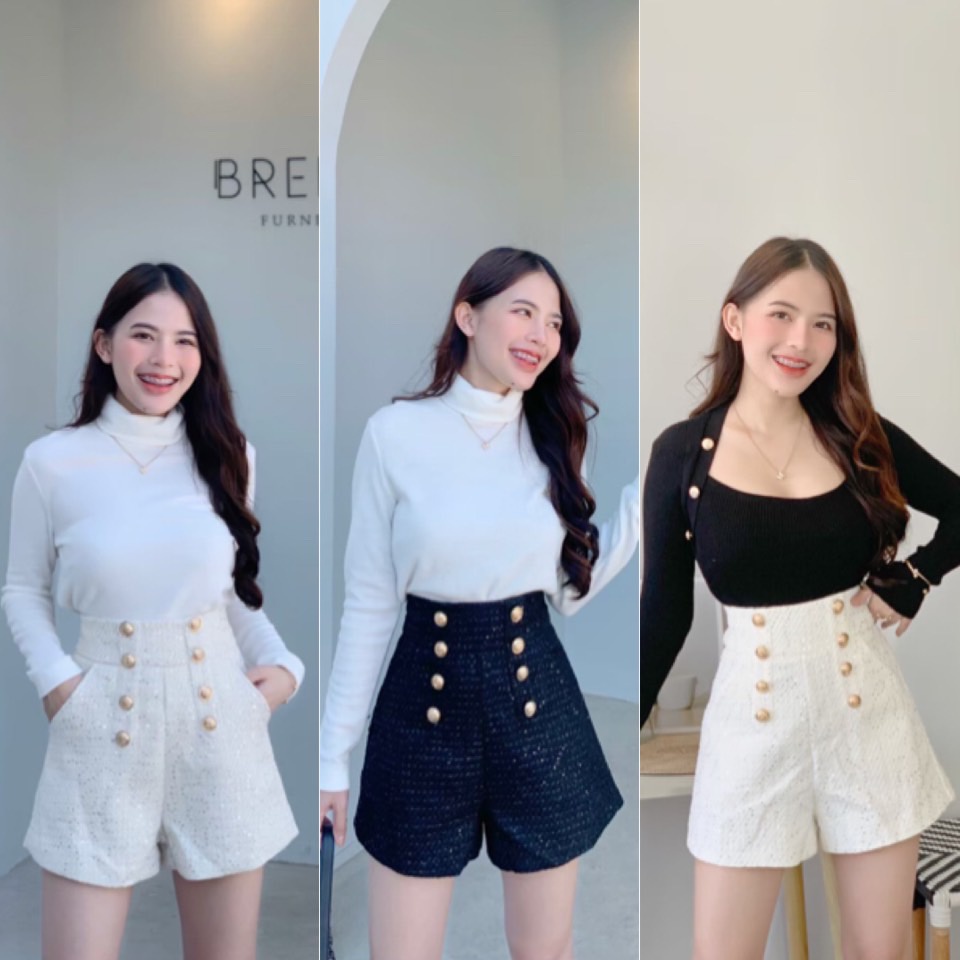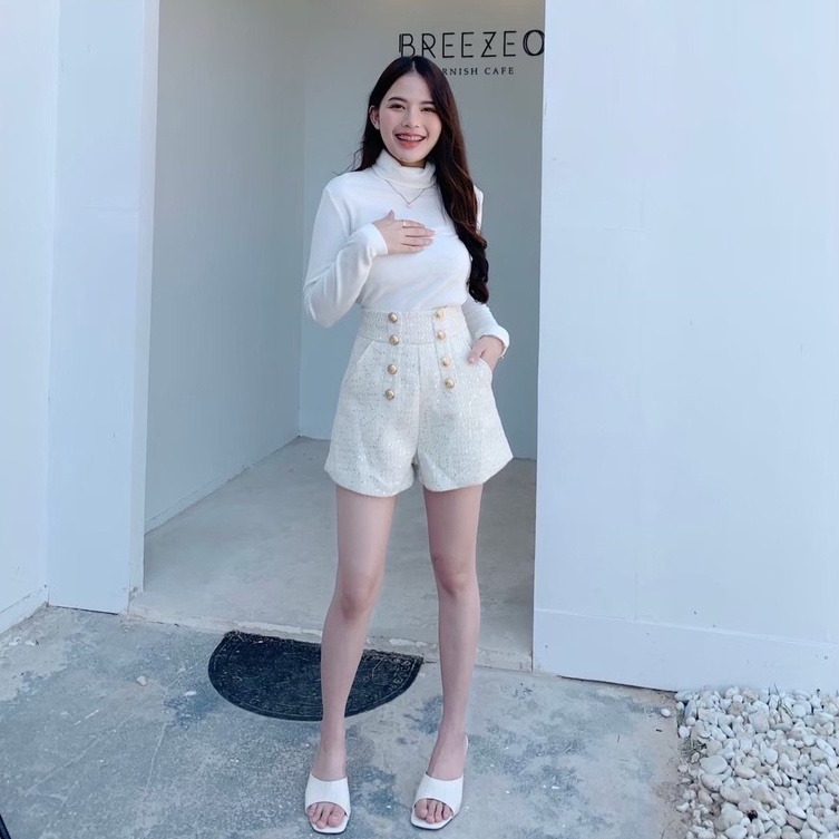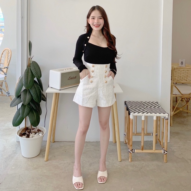 JARINYA 💛 กางเกงผ้าทวิตขาสั้น เอวสูง มีซับใน เนื้อผ้าเป็นผ้าทวิตค่อนข้างหนา ทอละเอียด (C10)