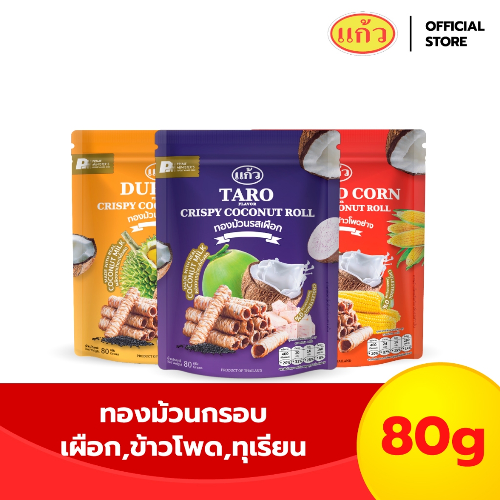 แถมกระเป๋า ฟรี! | แพ็ค 3 ถุง แก้ว ทองม้วนกะทิแท้ ขนาด 80 กรัม เลือกได้ 8 รส( ของฝาก กาญจนบุรี ขนมไทย ขนมกรุบกรอบ ขนมกินเ