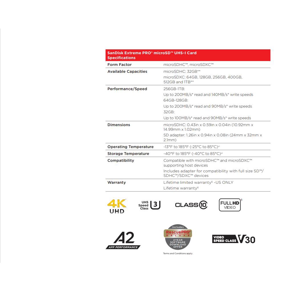 SanDisk Extreme Pro microSDXC 64GB / 128GB A2 (SDSQXCU, SDSQXCD) ความเร็วสูงสุด อ่าน 200MB/s เขียน 90MB/s