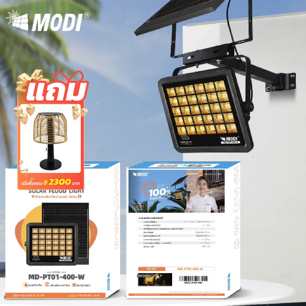MODI โคมไฟสปอตไลท์โซล่าเซลล์ 400W(4000lm) แสงขาว/เหลือง 35000mAh IP65 ส่องป้ายโฆษณา