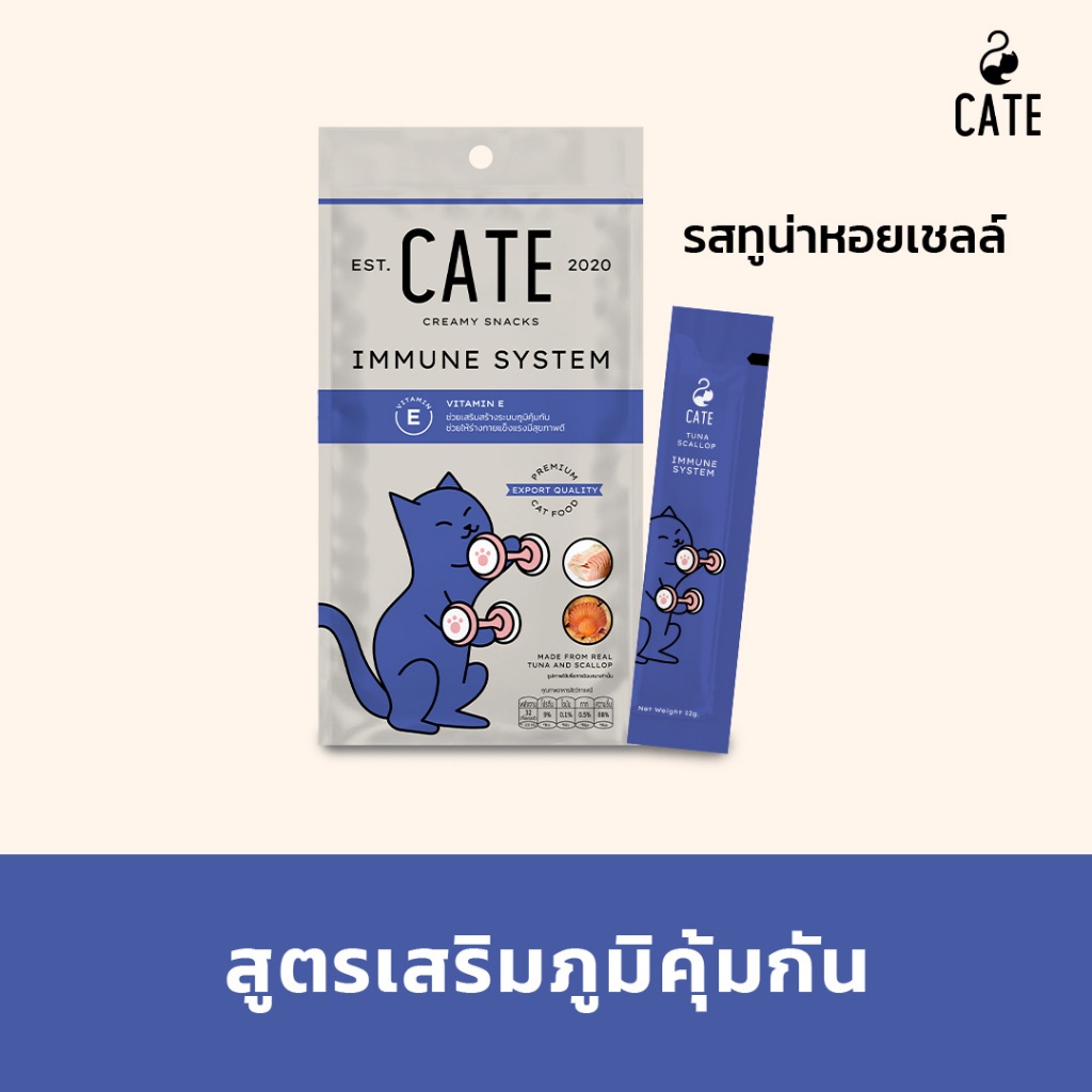 1 แพ็ค (4 ซอง) CATE เคท ขนมแมวเลีย รสทูน่าและหอยเชลล์ เสริมภูมิคุ้มกัน
