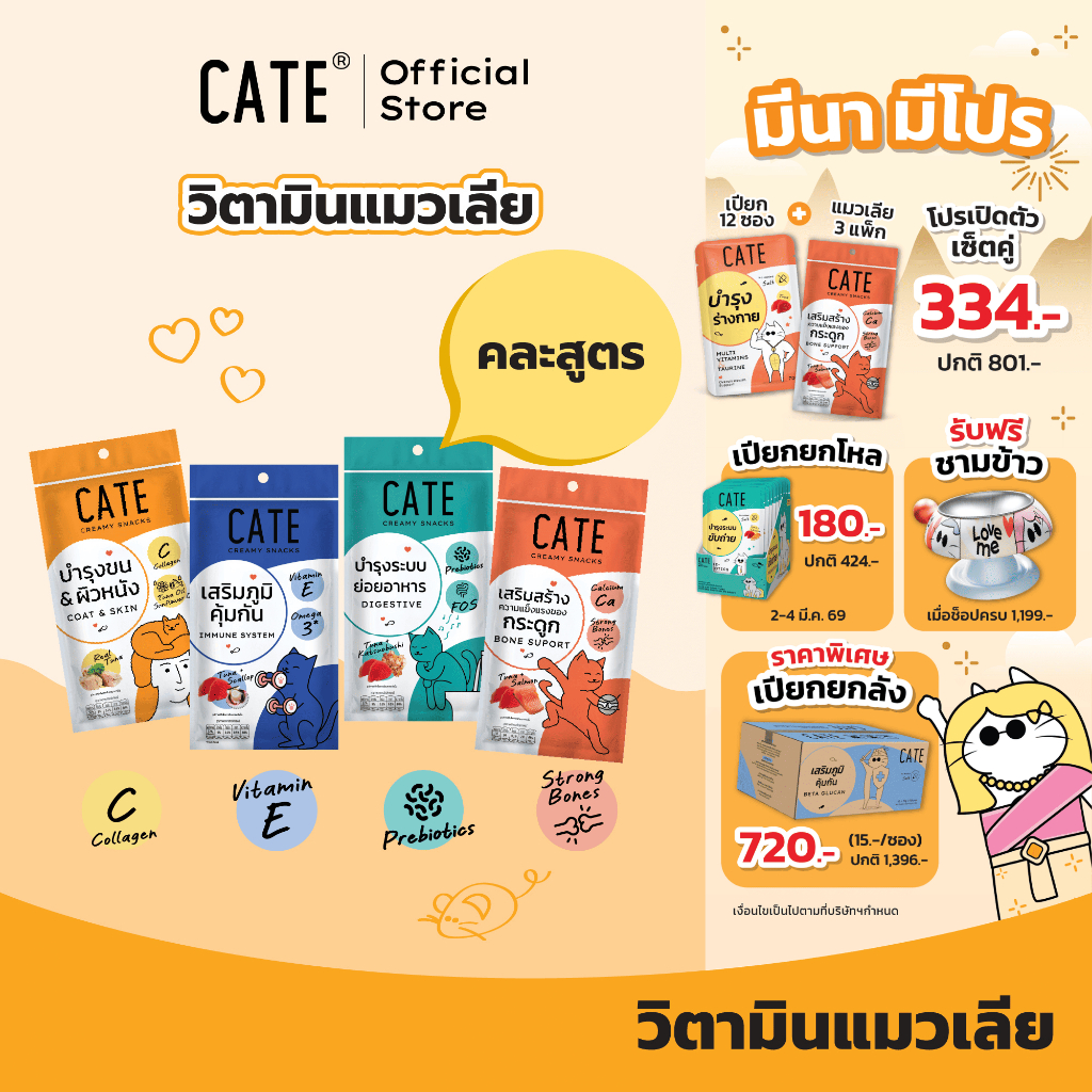 (คละสูตร) CATE เคท ขนมแมวเลียคละสูตร พรีไบโอติก เสริมภูมิ คอลลาเจน แคลเซียม