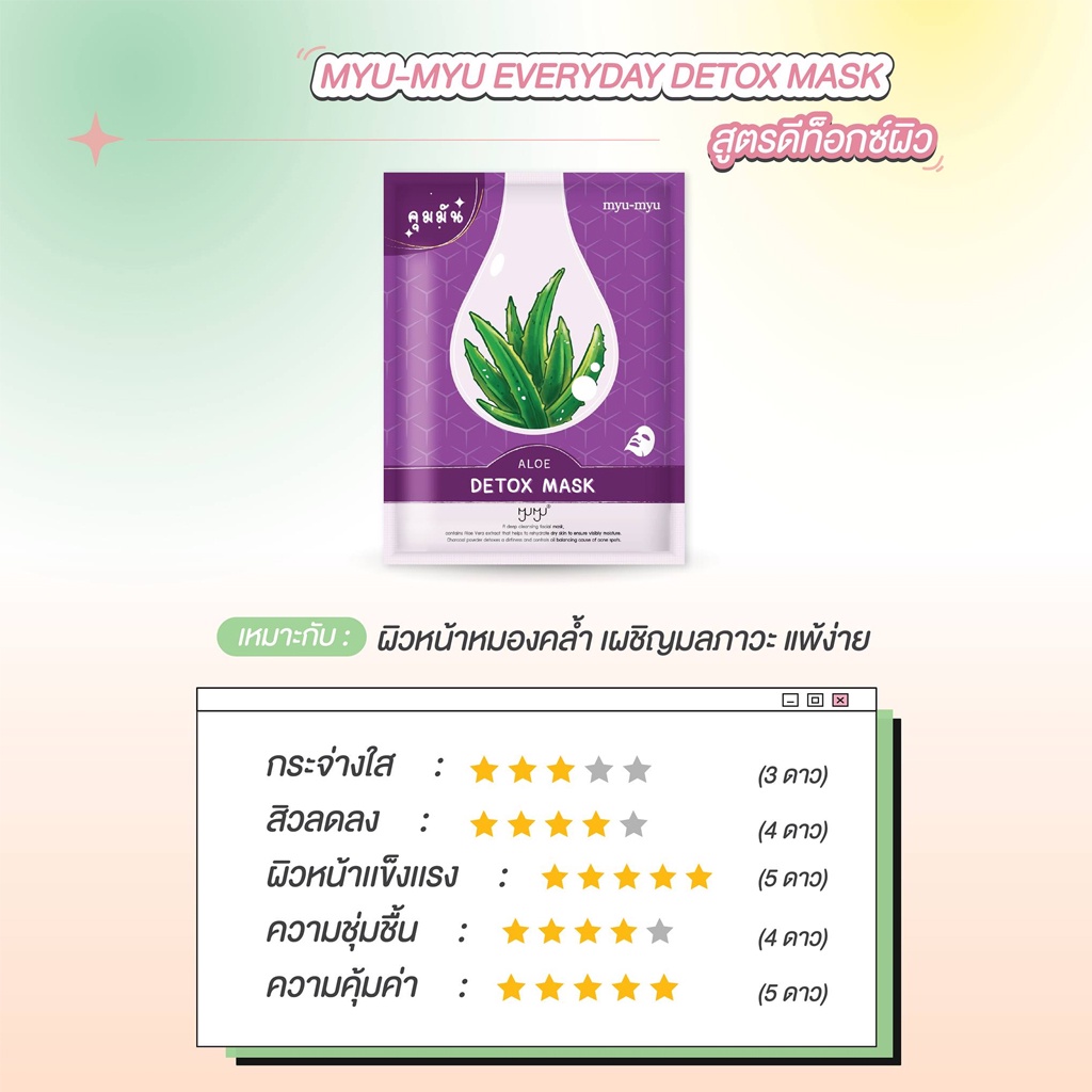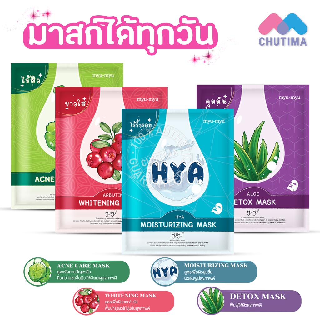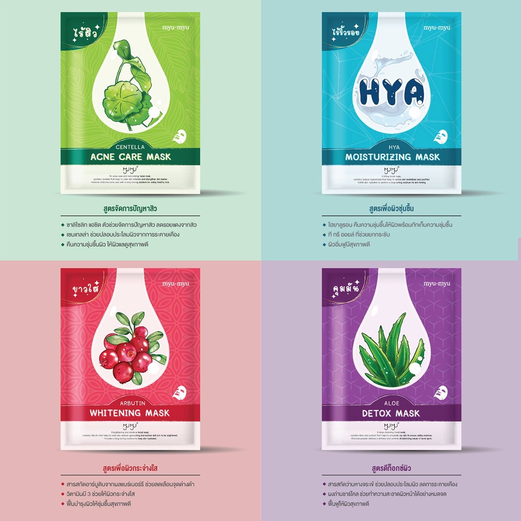 มาส์กหน้า มิว มิว 4 สูตร ขาวใส / ไร้สิว / ไร้ริ้วรอย / คุมมัน MYU-MYU Mask Hya / Centella / Aloe / Arbutin