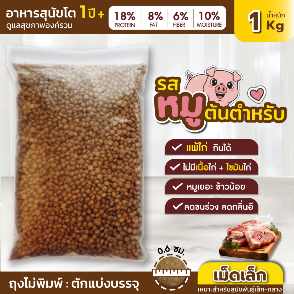 [1 กก] มีตังค์ อาหารสุนัข รสหมู เม็ดเล็ก (สุนัขโต พันธุ์เล็ก) แพ้ไก่กินได้ ไม่มีไขมันไก่