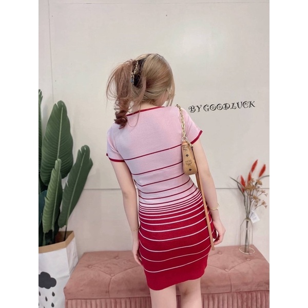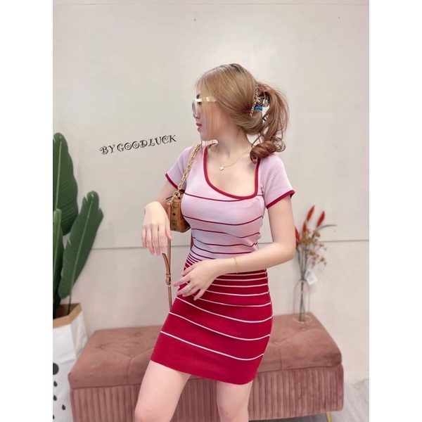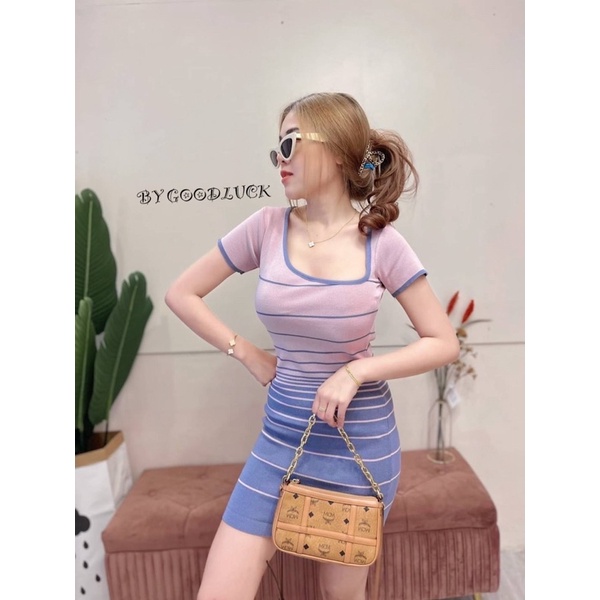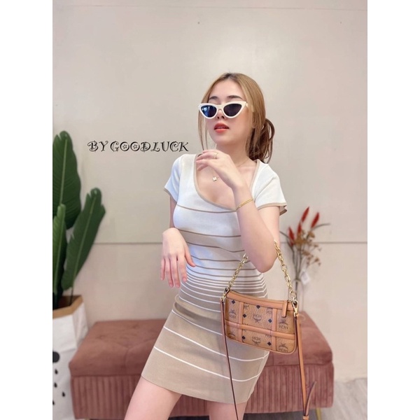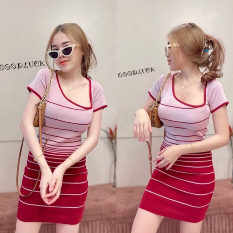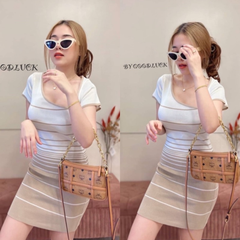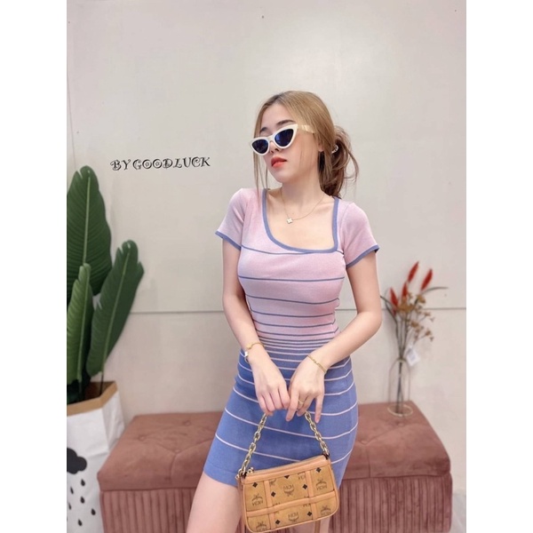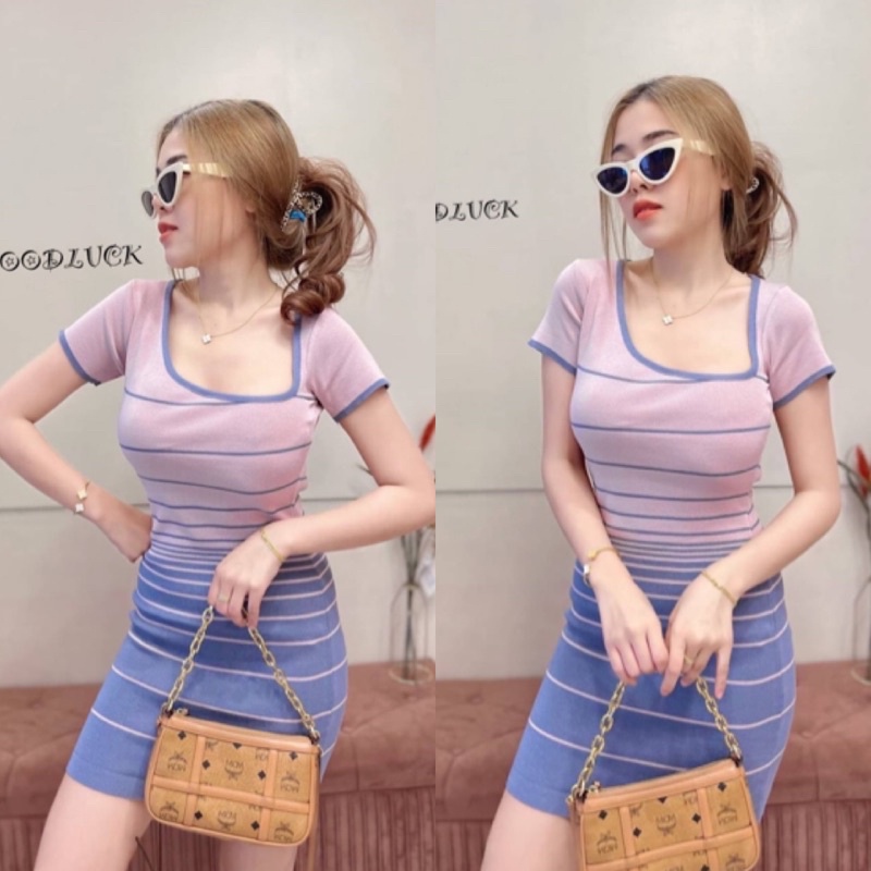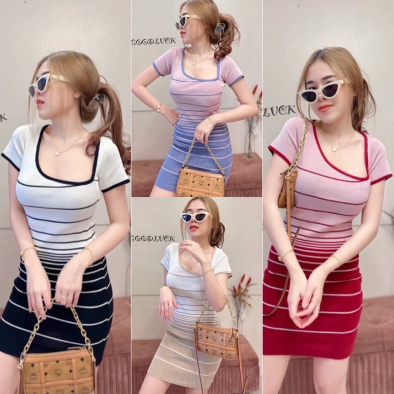 🔥aimorn_shop🔥มินิเดรส สีพาสเทลแต่งทูโทน💖💗💚ทอคาดลายเส้นตัดสี 🌹ทรงคอเหลี่ยมแขนสั้นผ้าไหมพรมงานสวย