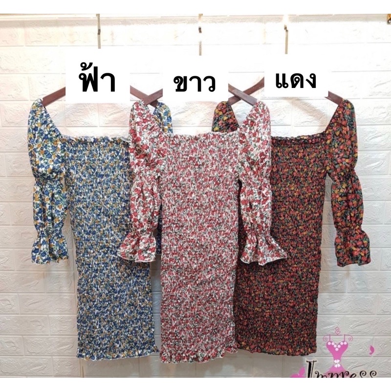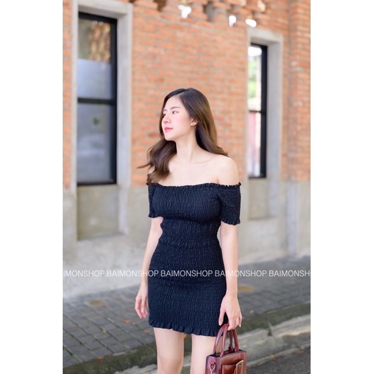 🔥aimorn_shop🔥 เดรสสั้นทรงปาดไหล่ 💚❤️งานผ้าเย็บสม็อกย่น❤️💜ใส่รัดรูปตามสัดส่วนเลยจ้า