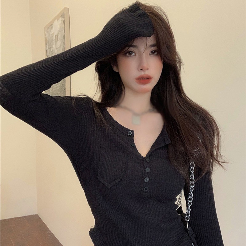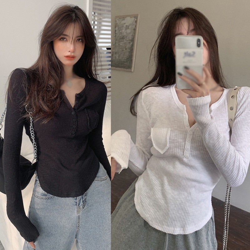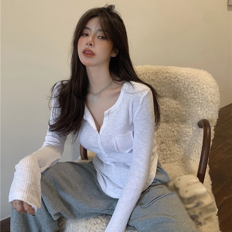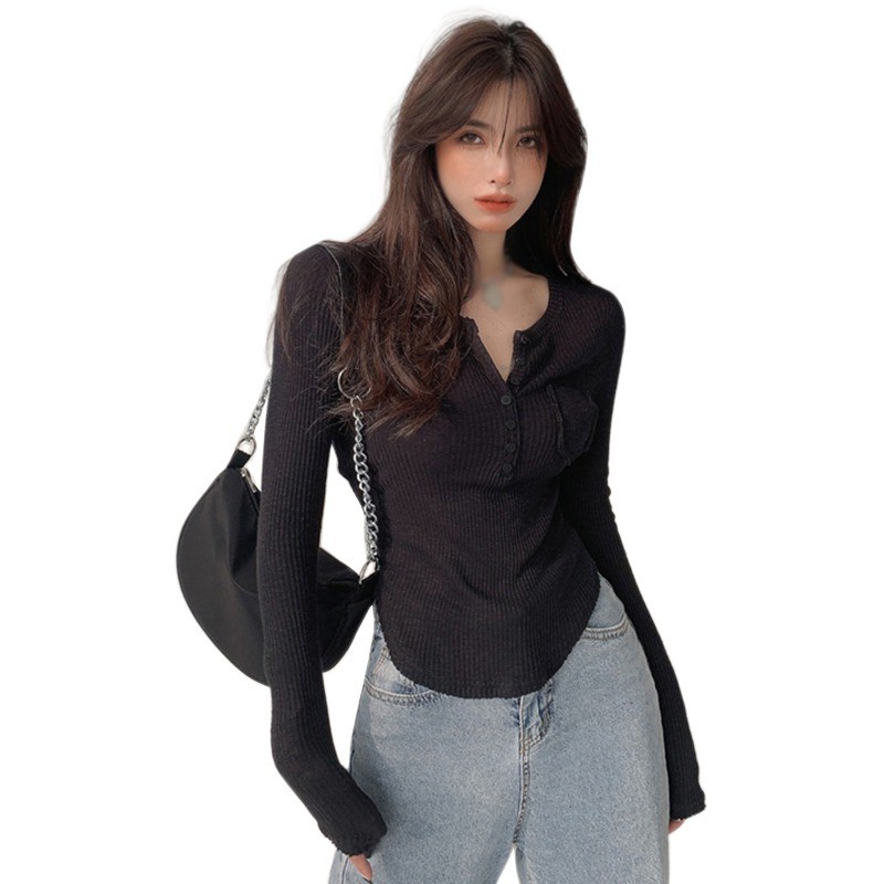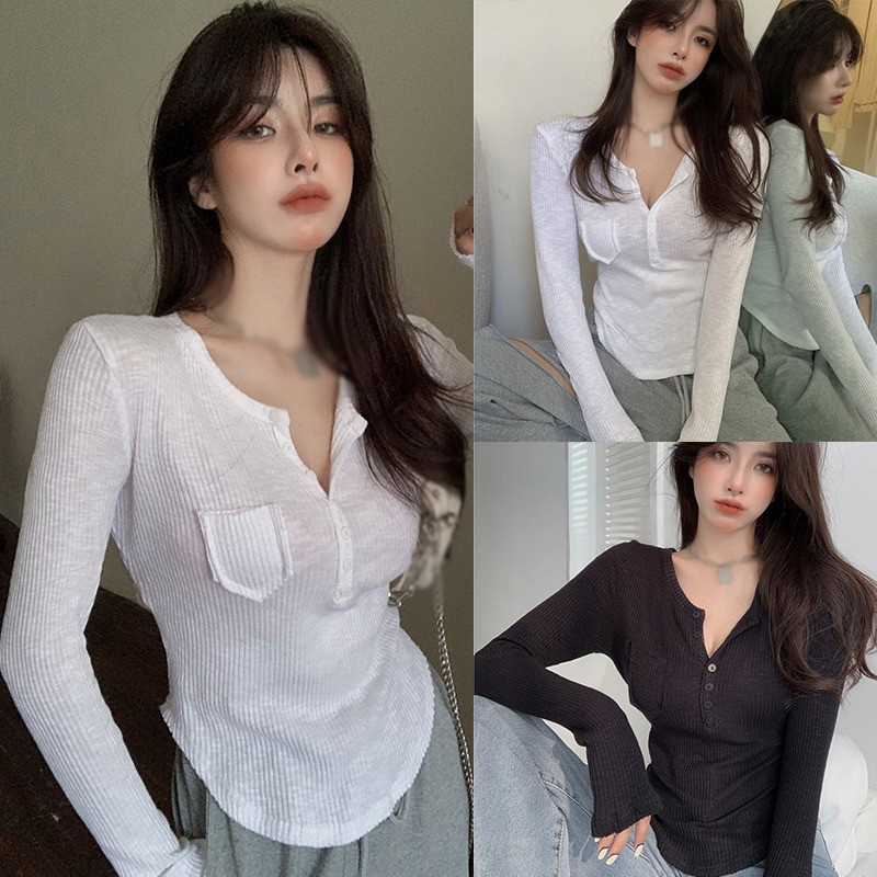 เสื้อยืดแขนยาว คอวี เรียบง่าย สําหรับผู้หญิง