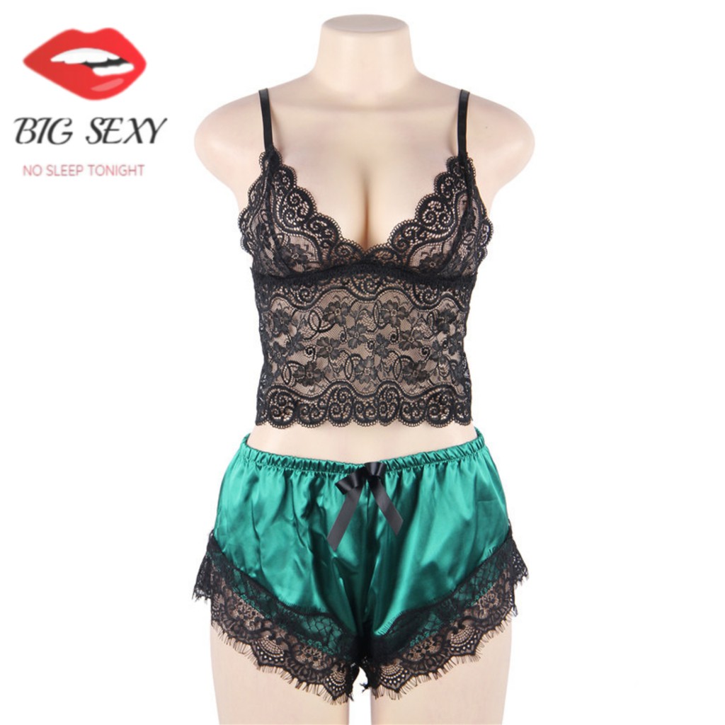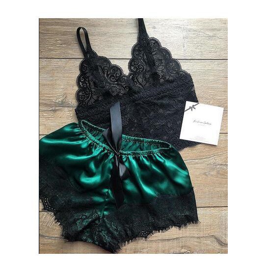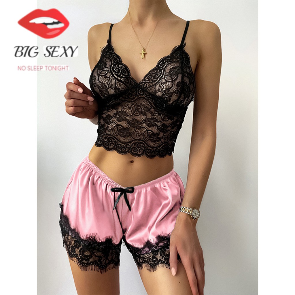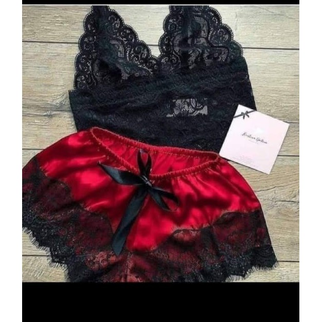 ชุดนอนกางเกงซาตินแบบ 2ชิ้นเสื้อแต่งระบาย กางเกงสั้นเอวยืดติดริบบิ้น S-061