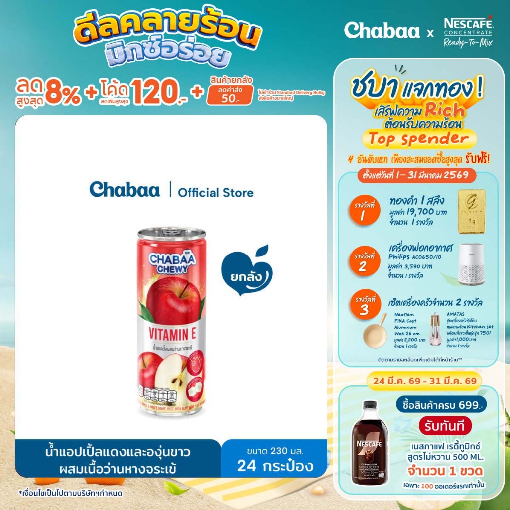 CHABAA CAN ชิววี่ น้ำแอปเปิ้ลแดง+องุ่นขาว30%+ว่านหางจระเข้+Vit.E ขนาด 230 มล. ยกถาด (24 กระป๋อง)
