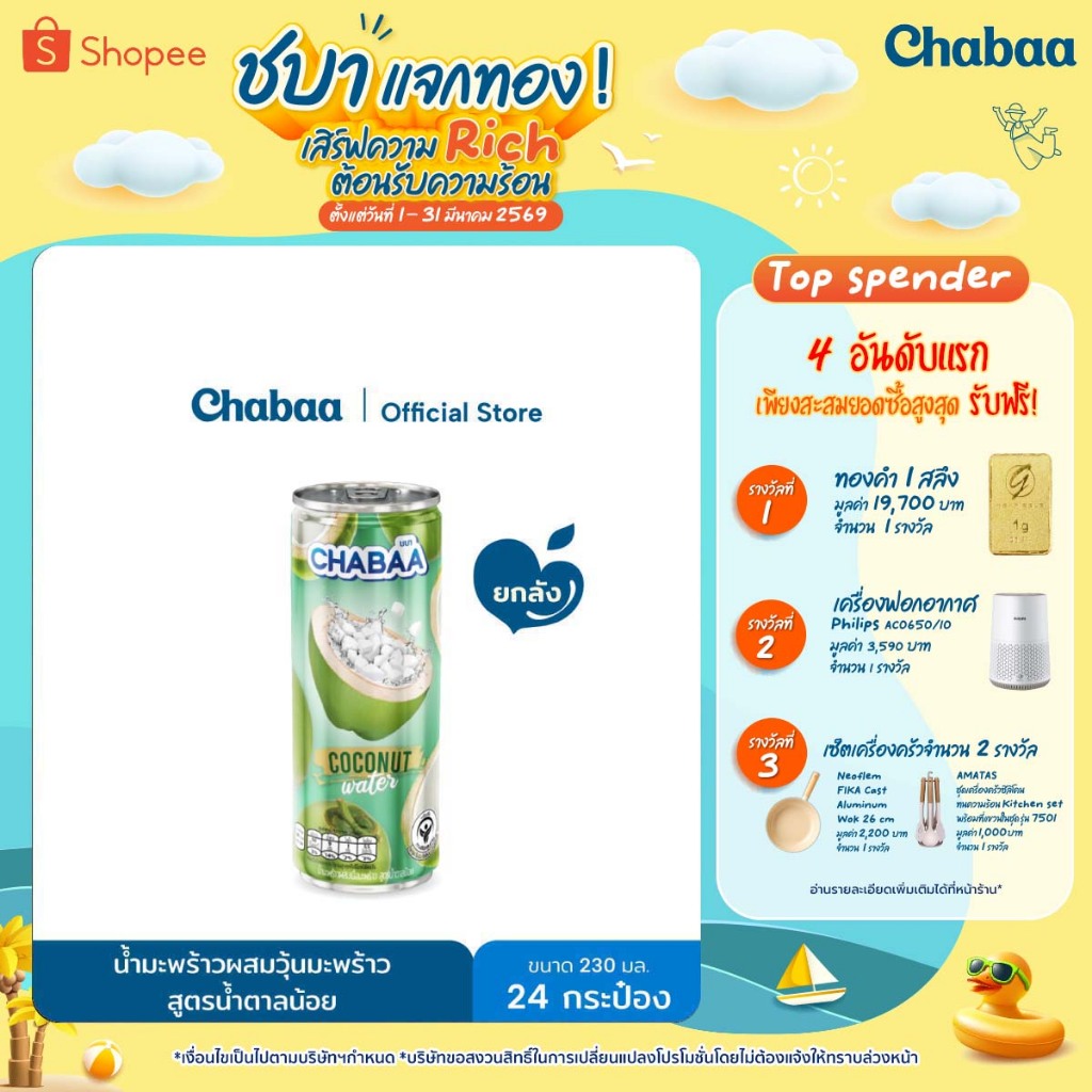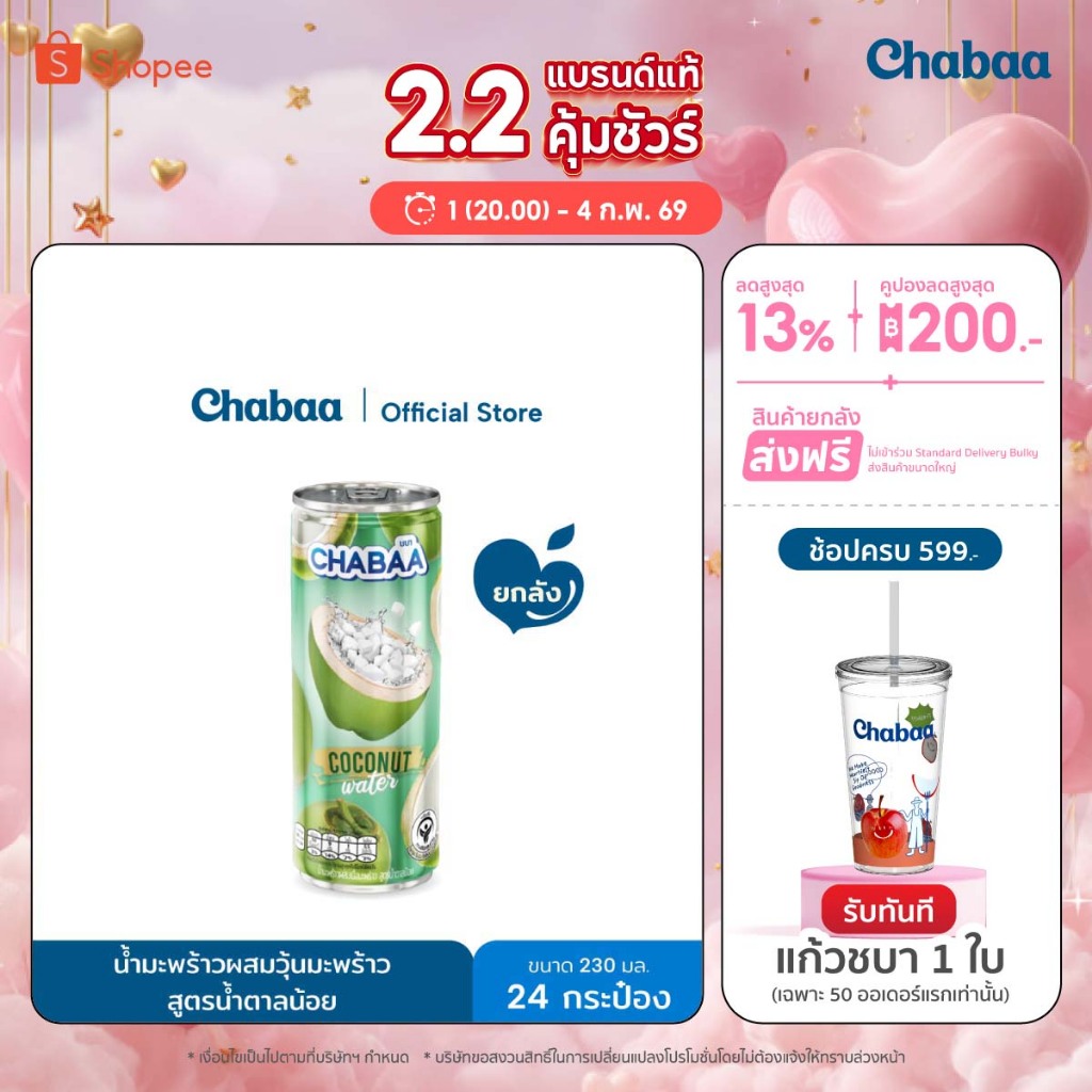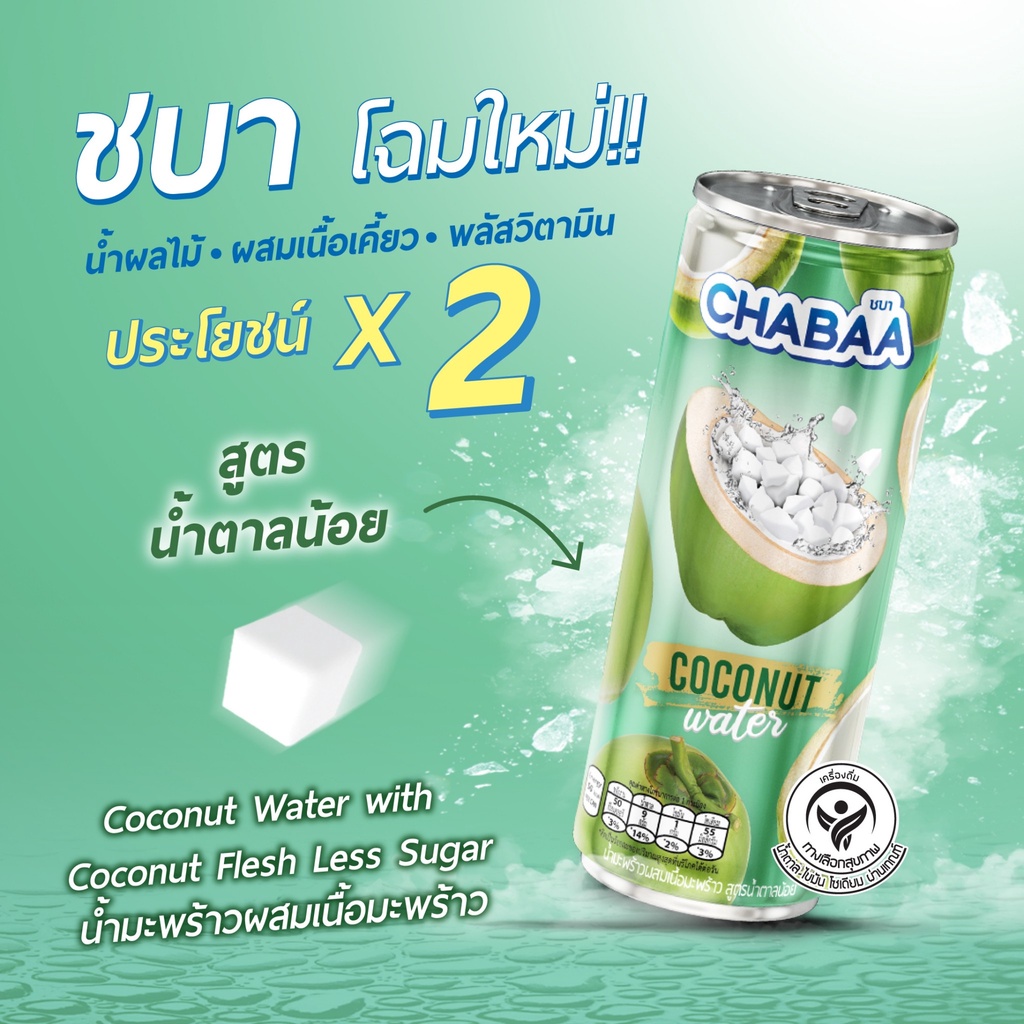 CHABAA CAN น้ำมะพร้าว 70% ผสมเนื้อมะพร้าว สูตรน้ำตาลน้อย ขนาด 230 มล. ยกถาด (24 กระป๋อง)
