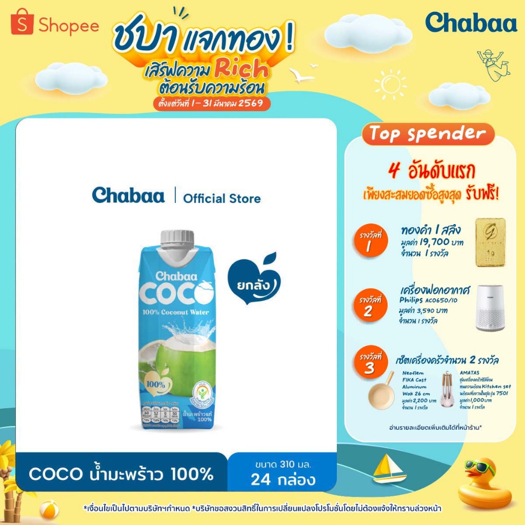 CHABAA COCO น้ำมะพร้าว 100% 310 มล. ยกลัง( 24 กล่อง )