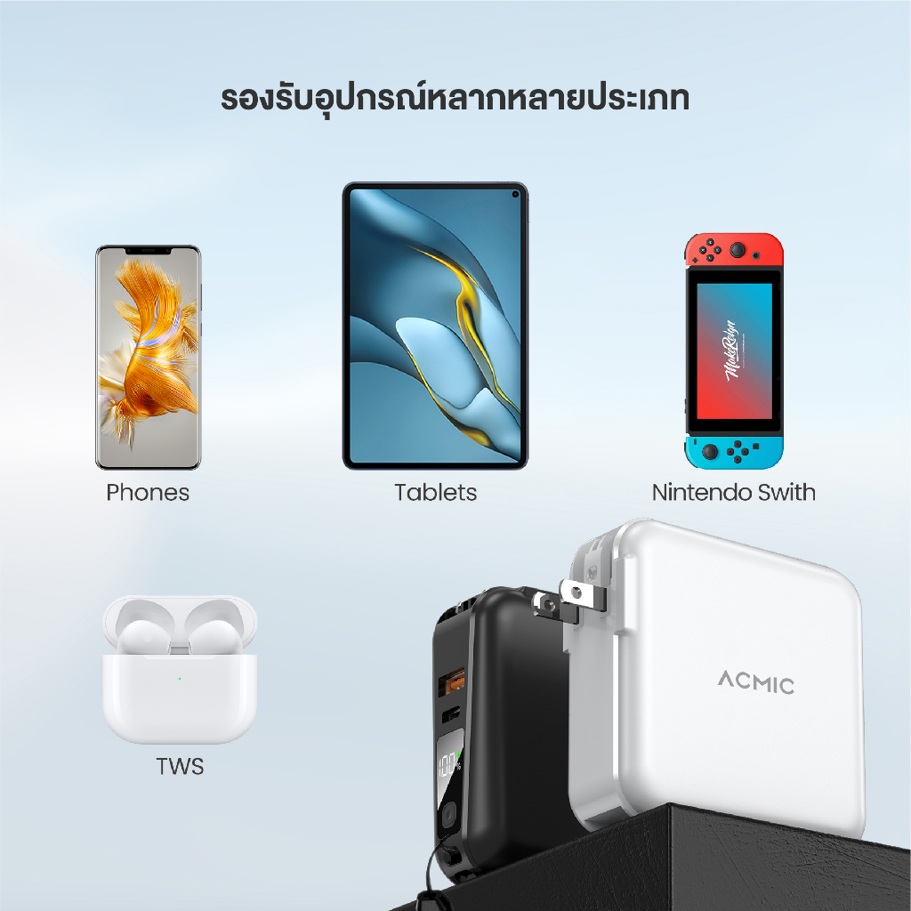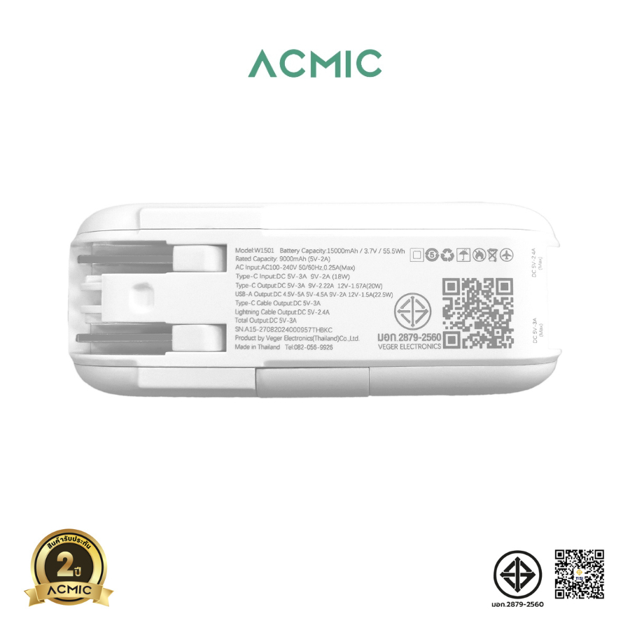 [รับประกัน 2 ปี] ACMIC W1501 Powerbank 15000mAh พาวเวอร์แบงค์ชาร์จเร็ว Fast Charge PD20W มีสายในตัว หน้าจอ LED