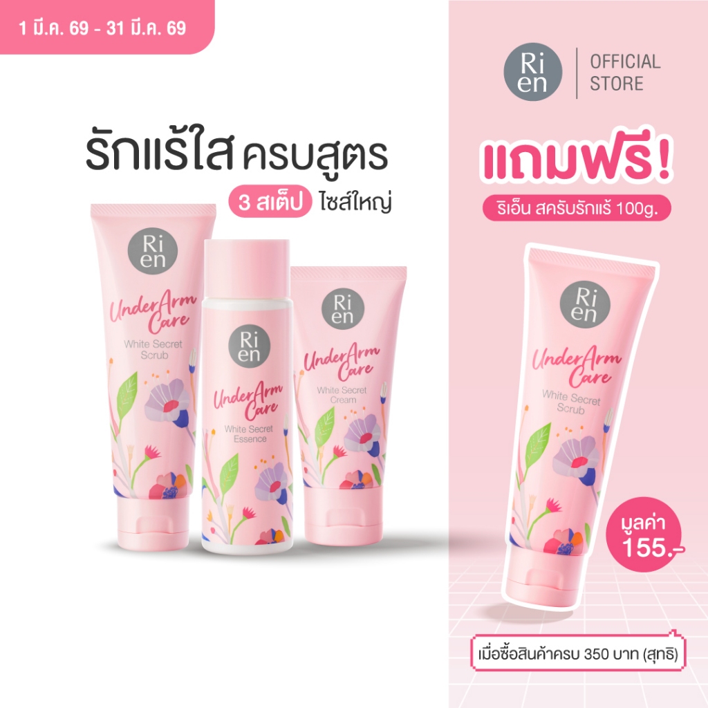 ริเอ็น อันเดอร์อาร์มแคร์ ไวท์ ซีเคร็ท 3 สเต็ป (สครับ 100g+ เอสเซ้นส์ 100 ml + ครีม 50g) บำรุงรักแร้