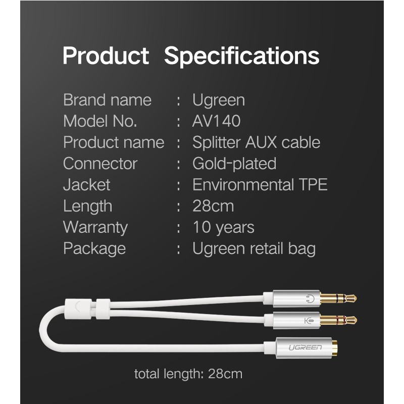 Ugreen สายสปลิตเตอร์ ทรงตัว Y ขนาด 3.5 มม. ตัวเมีย แปลงเป็น 2 ตัวผู้ ยาว 28 ซม. สำหรับหูฟังต่อเข้าคอม