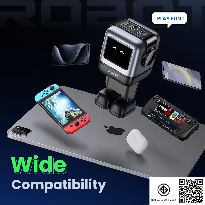 Ugreen Uno RoboGaN 65W USB C USB A Charger Mini Robot Nexode 3 พอร์ต GaN Fast Charger สําหรับ iPhone 16 Pro Max 15/15 Pro Max 14/14 Pro Max/Macbook Air/iPad Pro/iPad Mini