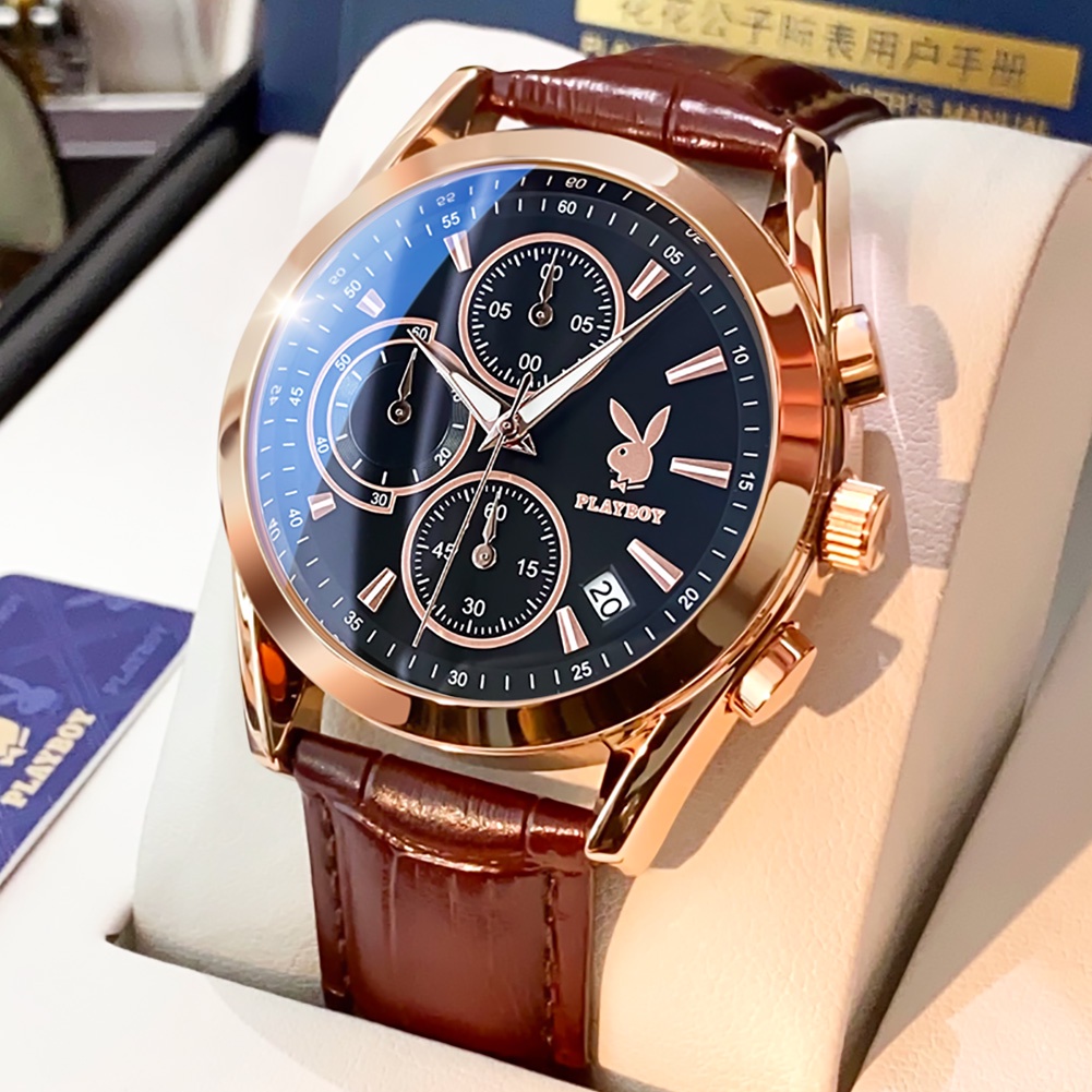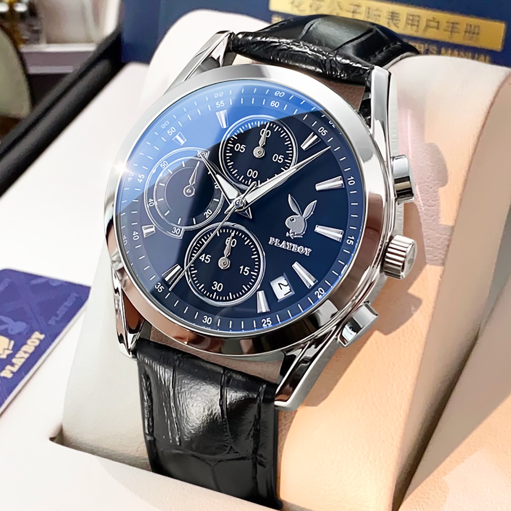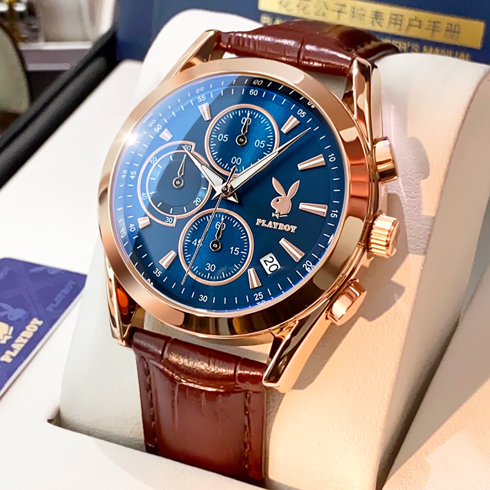 PLAYBOY นาฬิกาผู้ชาย กันน้ำ 100% สายหนัง สไตล์ธุรกิจ โครโนกราฟ ส่องสว่าง สีฟ้า สีดำ สีขาว ทอง นาฬิกาข้อมือ รุ่น: 3042
