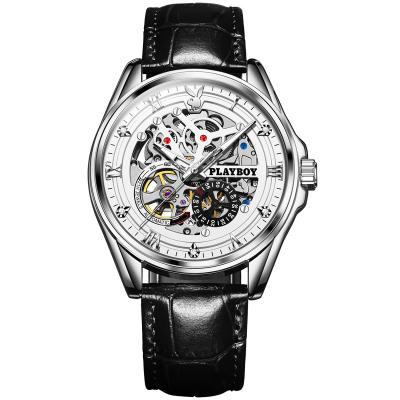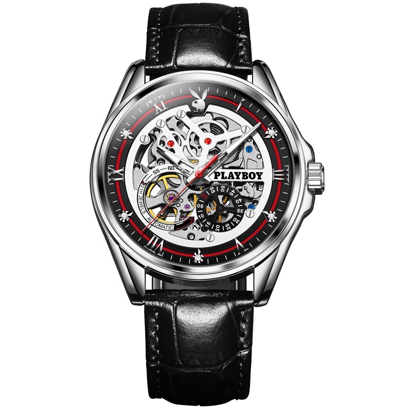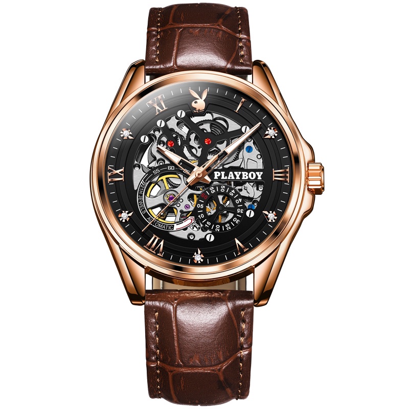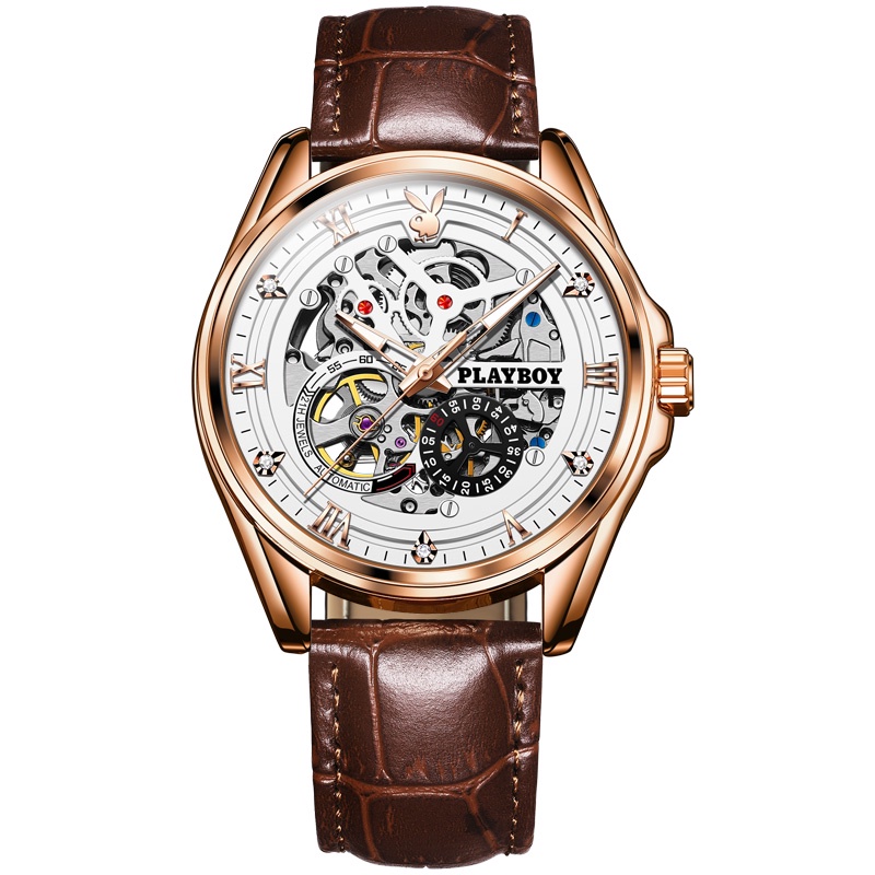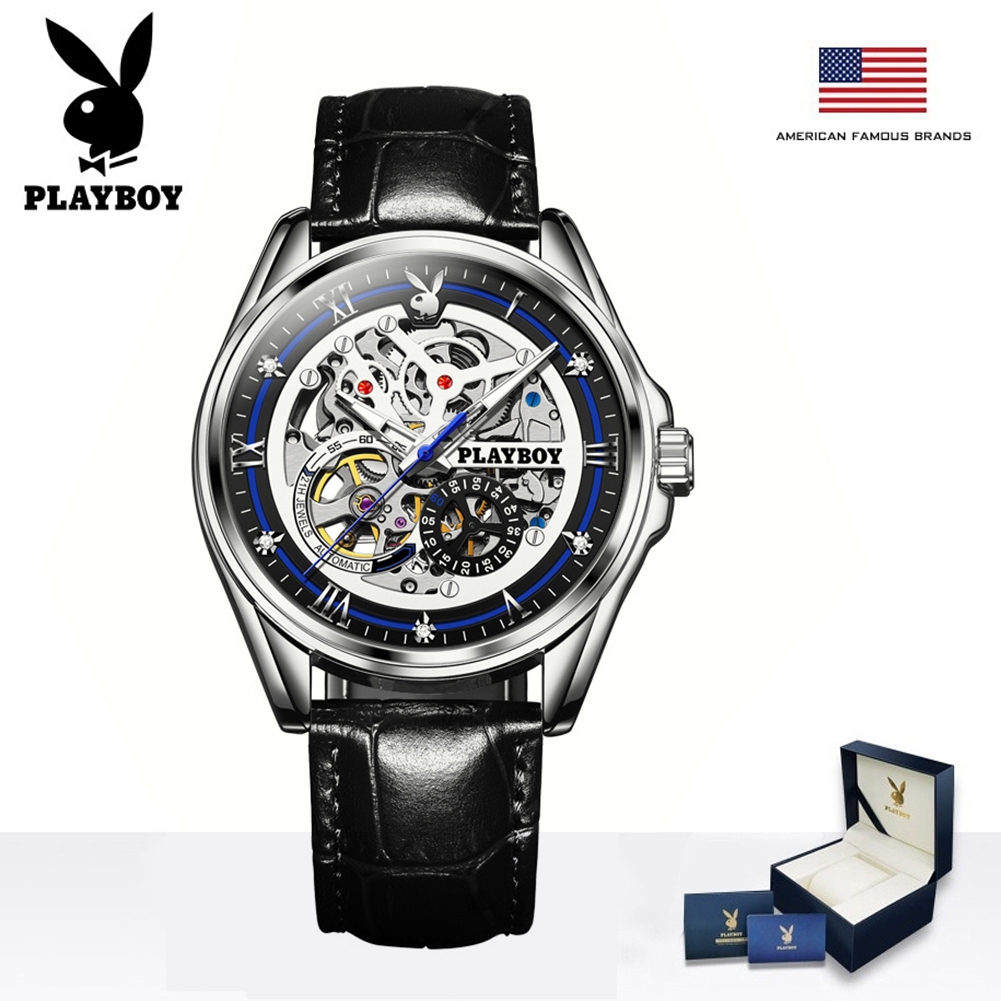 PLAYBOY นาฬิกา นาฬิกาผู้ชายแท้ เครื่องกลอัตโนมัติ นาฬิกาข้อมือกันน้ำ สายหนังแท้ รับประกัน 3 ปี ของขวัญวันวาเลนไทน์ วันพ่อ 3032