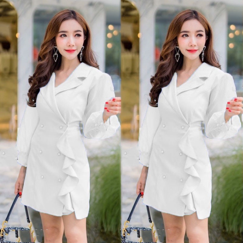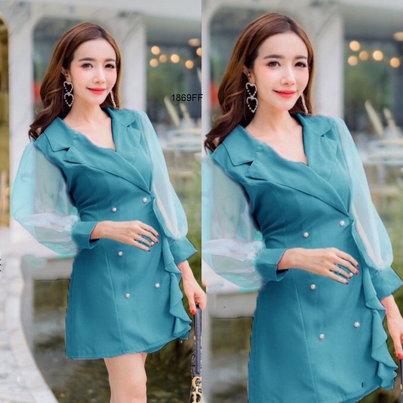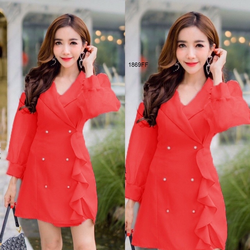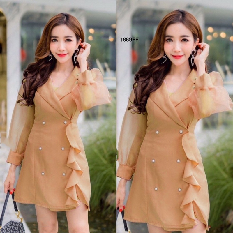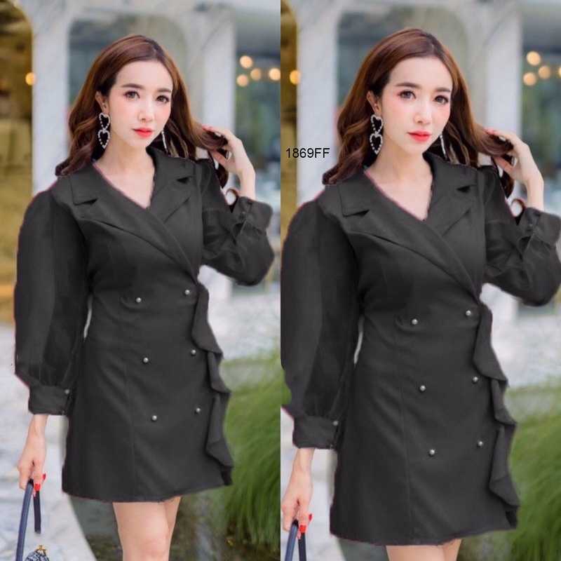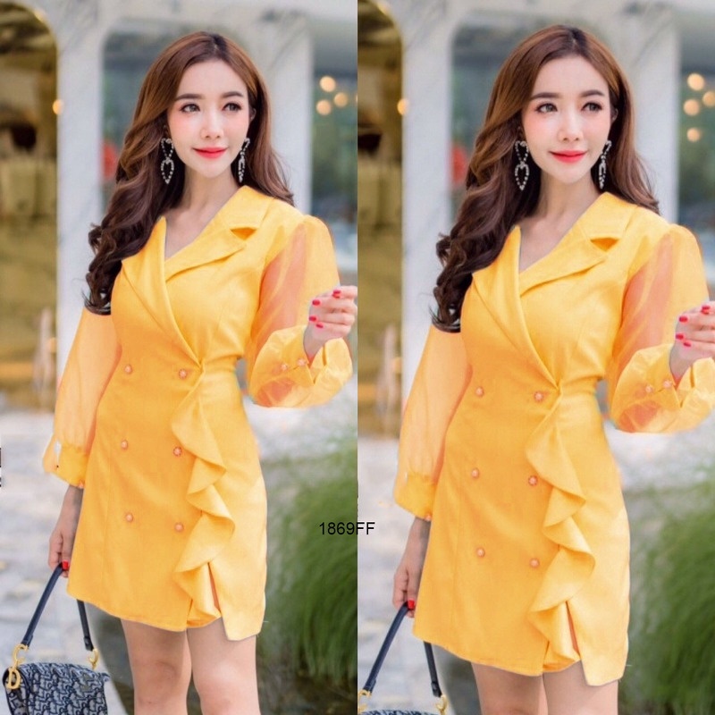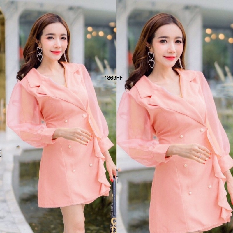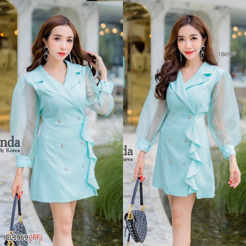CL1869 🚩 มินิเดรสสีพื้นแขนยาวซีทรู คอปกแต่งระบายไล่ด้านหน้า