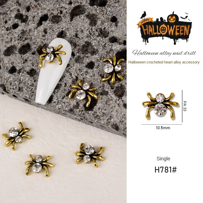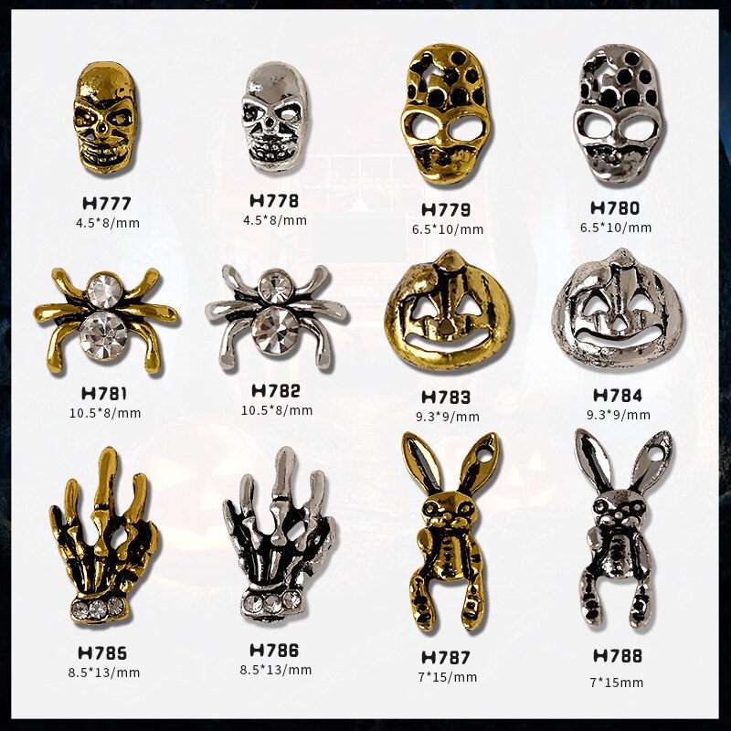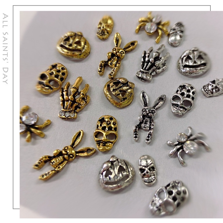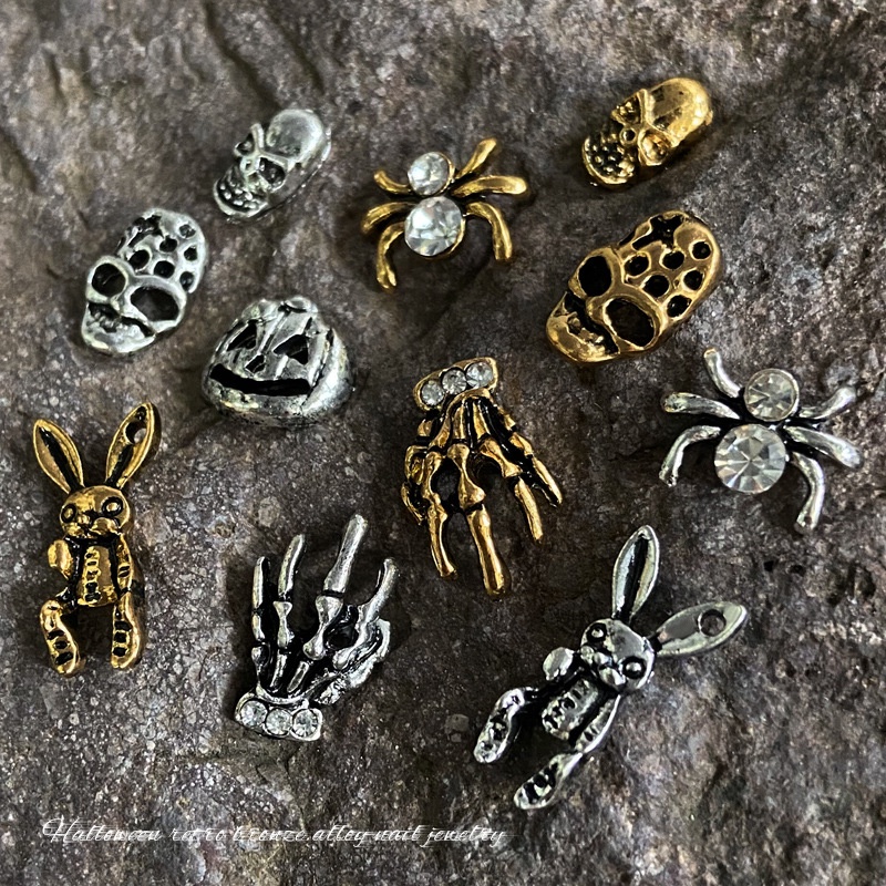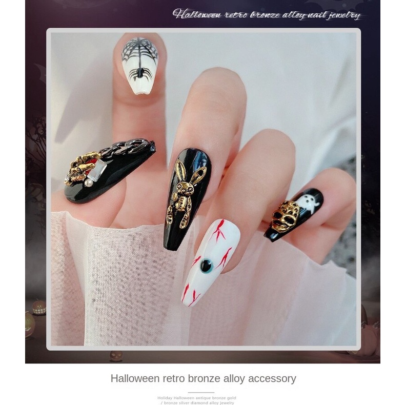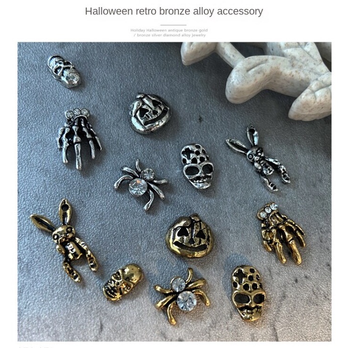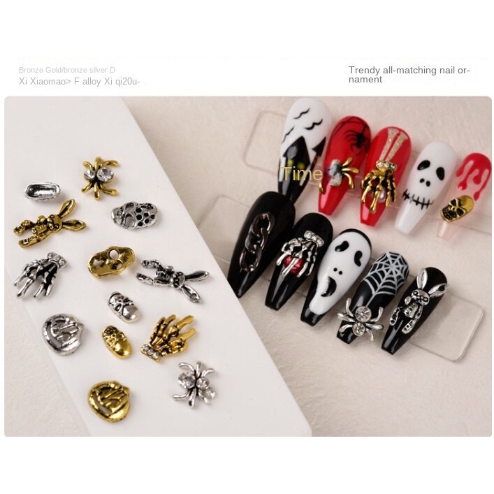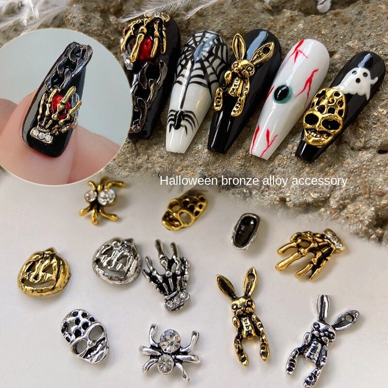 เครื่องประดับเล็บโลหะฮาโลวีน / เล็บผีเพชรประดับเล็บผีใบหน้ากะโหลกศีรษะแมงมุมเล็บ / เครื่องประดับเล็บโลหะผสมวินเทจ