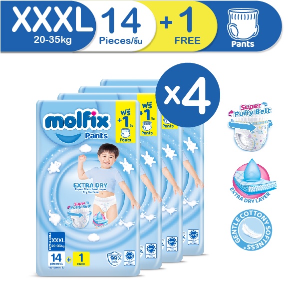 Molfix กางเกงผ้าอ้อมโมลฟิกซ์ เอ็กซ์ตร้า ดราย แพ้นส์ 3XL 14+1 ชิ้น x4 (ยกลัง)