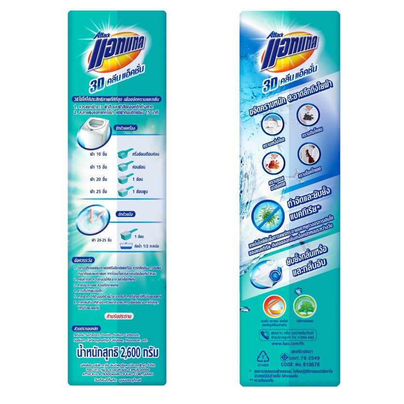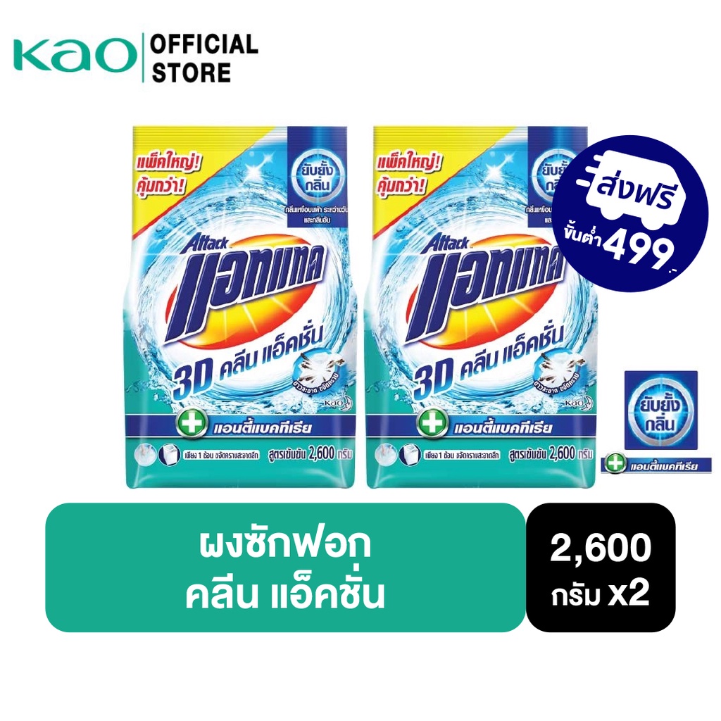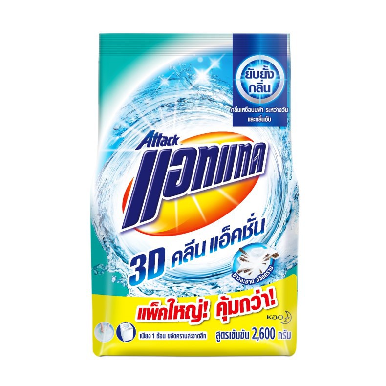 [แพ็ค2] แอทแทค 3D คลีน แอ็คชั่น ผงซักฟอก สูตรเข้มข้น 2600 G Attack 3D Clean Action Powder Detergent 2600G
