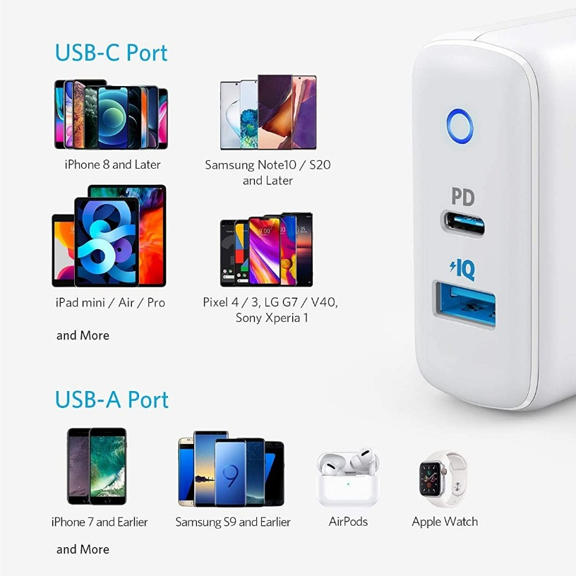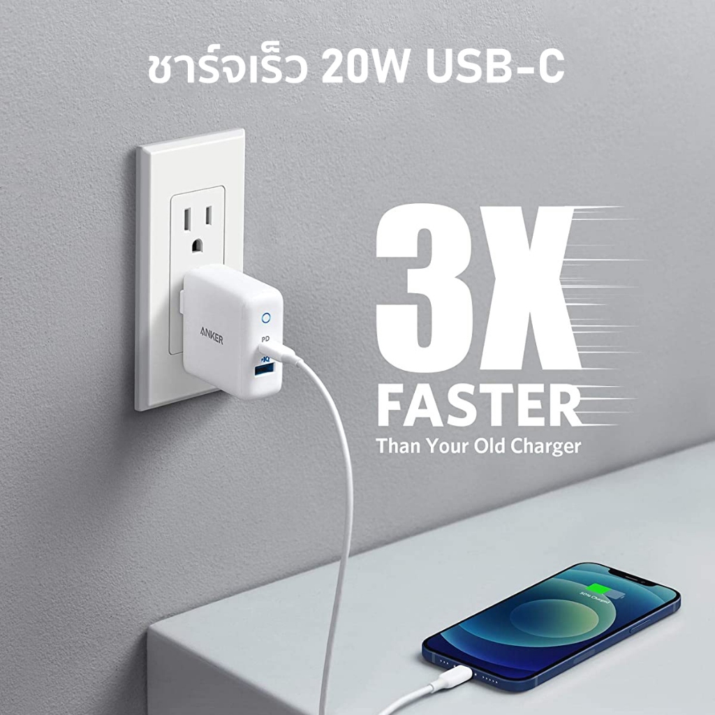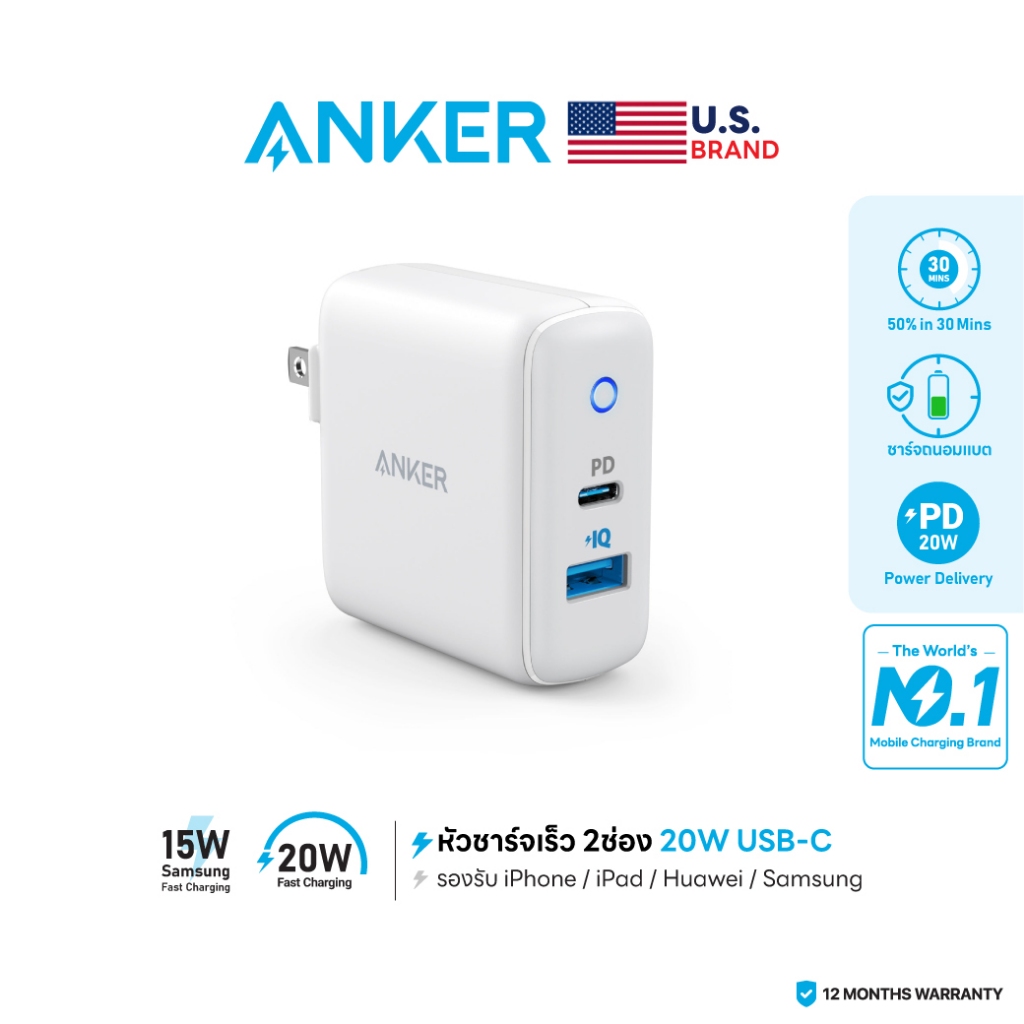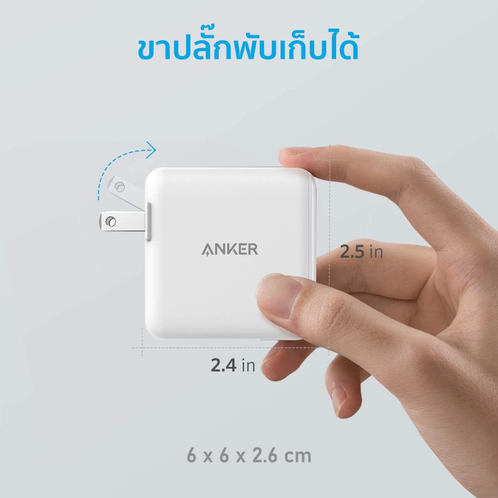 Anker PowerPort PD+2 หัวชาร์จ 20W USB-C for iPhone และ 15W USB-A for Samsung ขาพับเก็บได้
