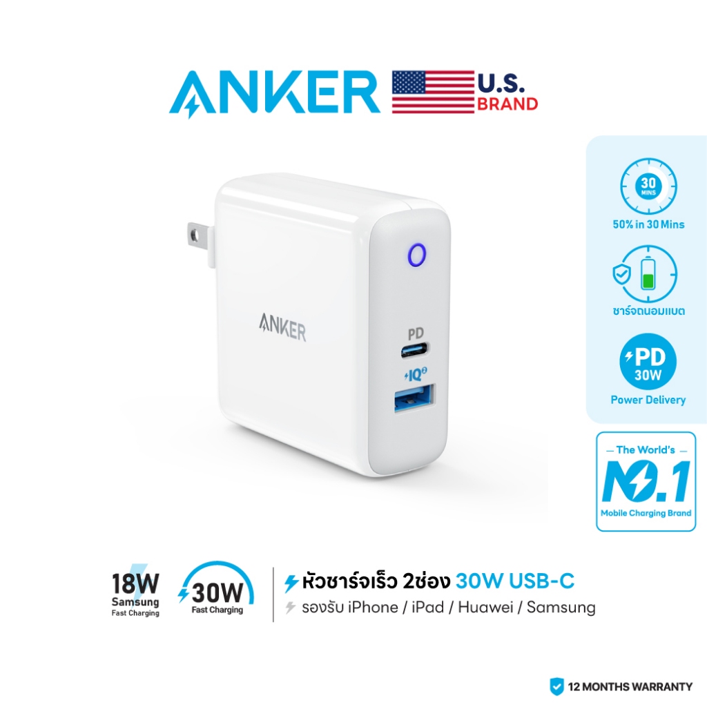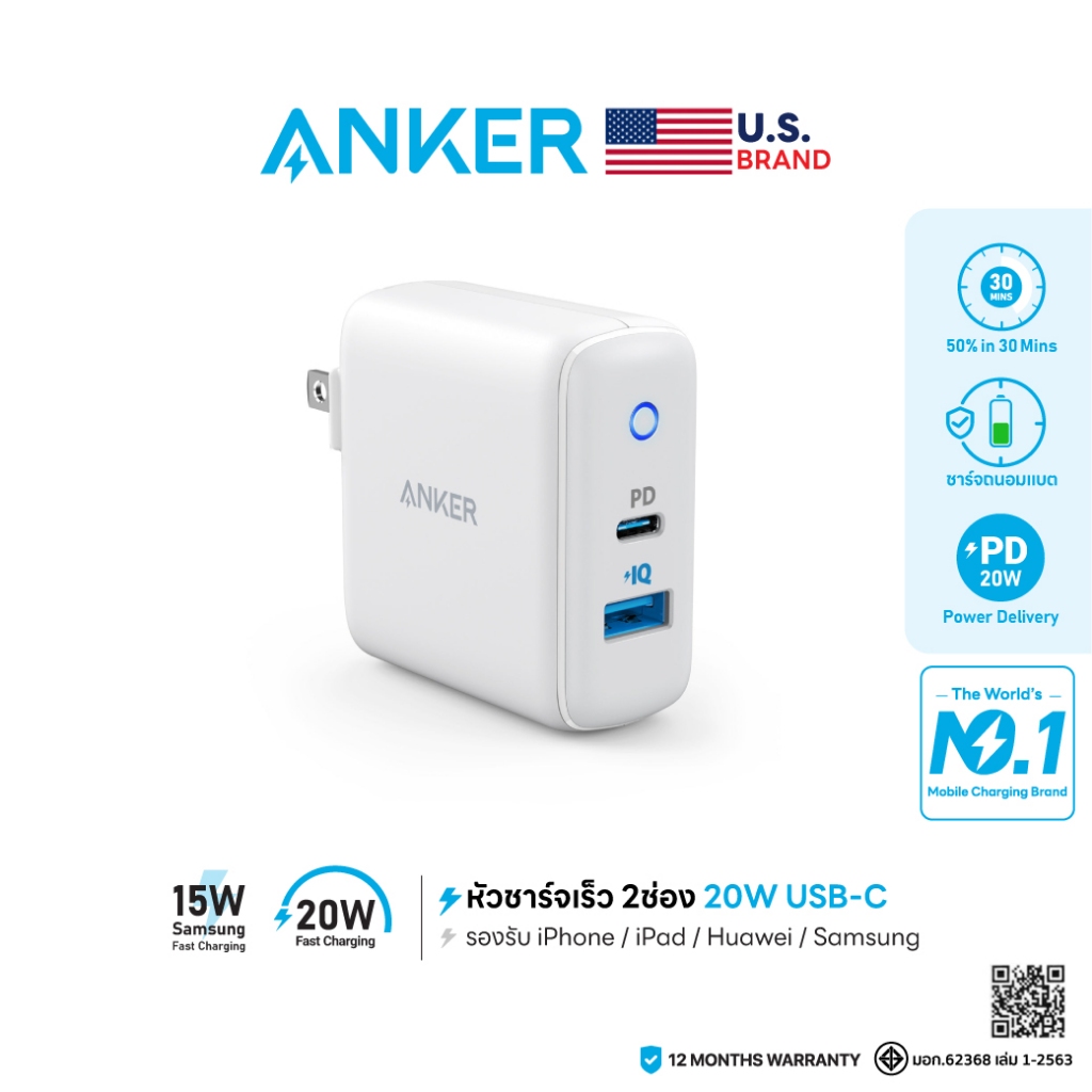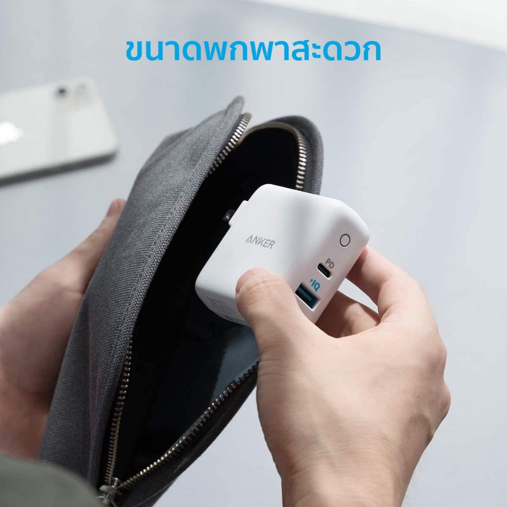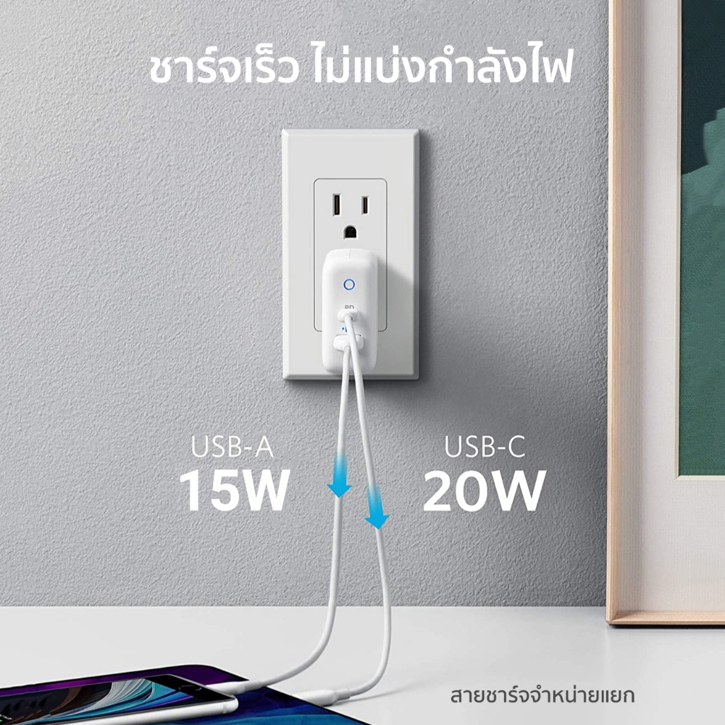 Anker PowerPort PD+2 หัวชาร์จ 20W USB-C for iPhone และ 15W USB-A for Samsung ขาพับเก็บได้