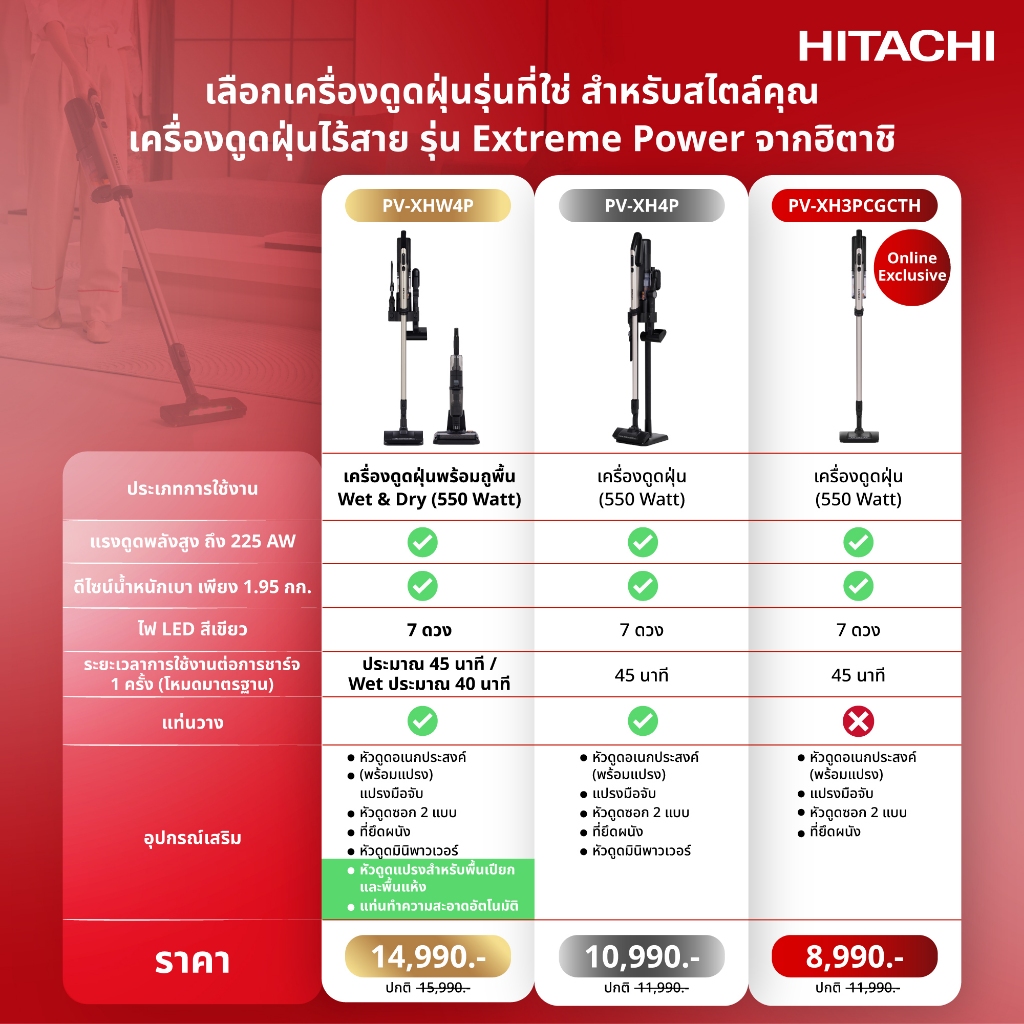 Hitachi ฮิตาชิ เครื่องดูดฝุ่นชนิดไร้สาย 550 วัตต์ 1.95 กก รุ่น PV-XH4PCGCTH / Wet & Dry 550 วัตต์ PV-XHW4PCGCTH