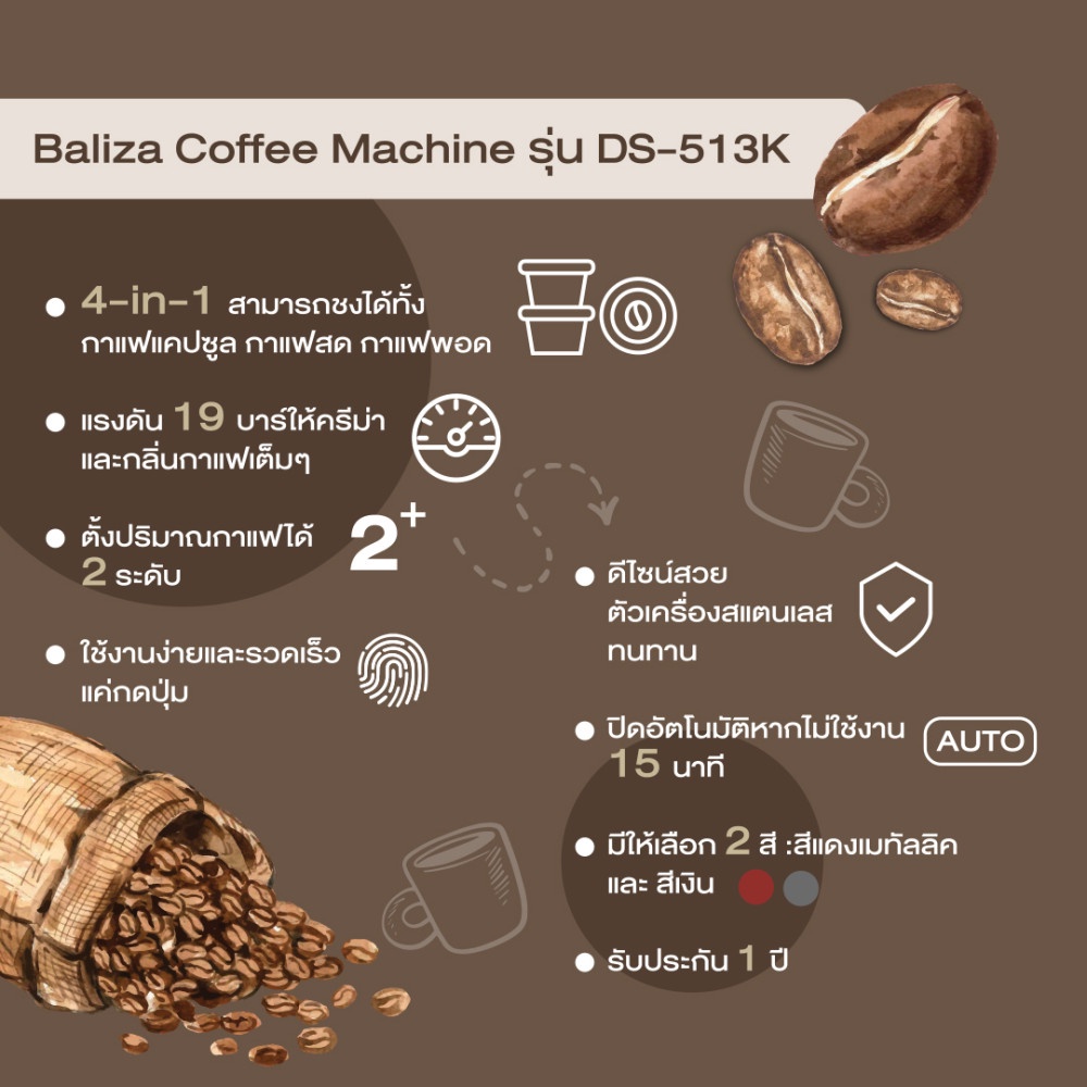 [ประกันศูนย์ 1 ปี] BALIZA Coffee Machine เครื่องชงกาแฟอัตโนมัติ 4 in 1 แคปซูล 2 แบบ,กาแฟบด, กาแฟพอด