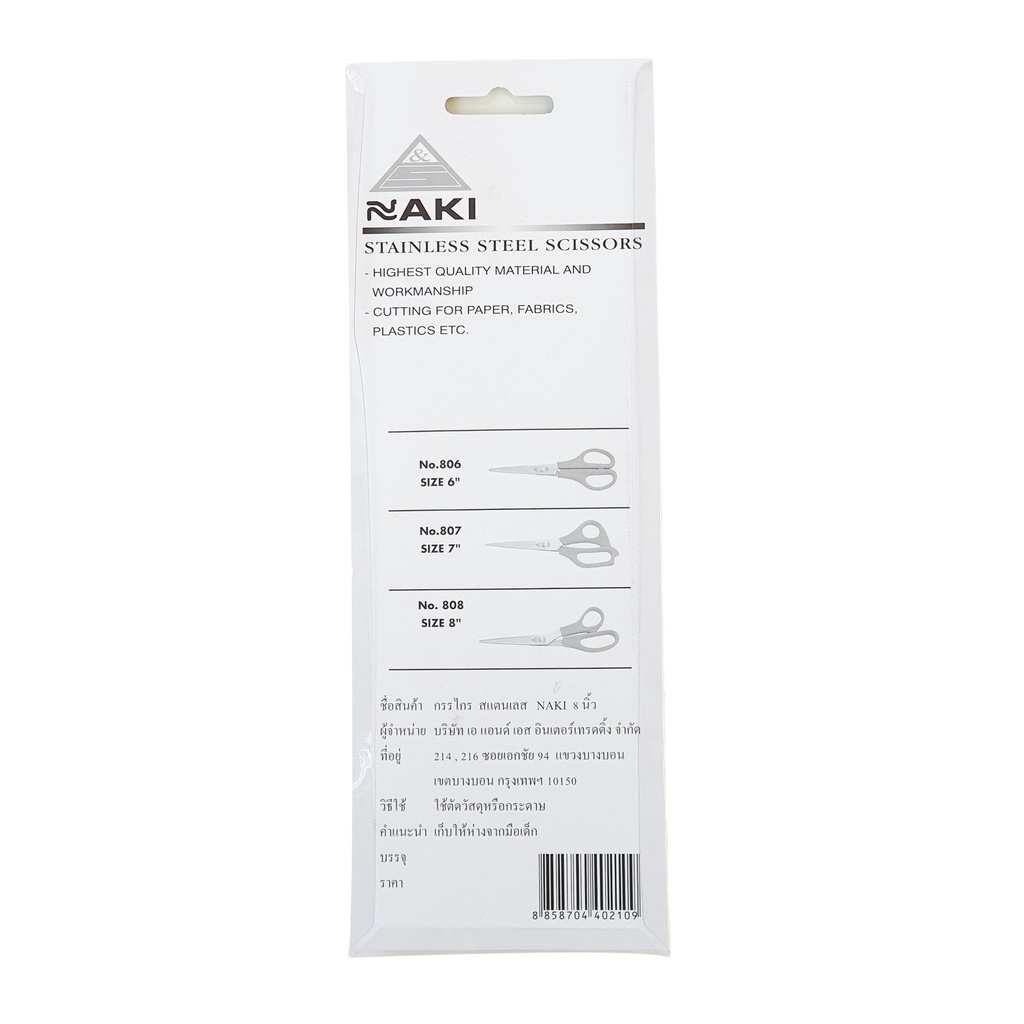 NAKI กรรไกร สแตนเลส ขนาด 8 นิ้ว No.808 Stainless Steel Scissors