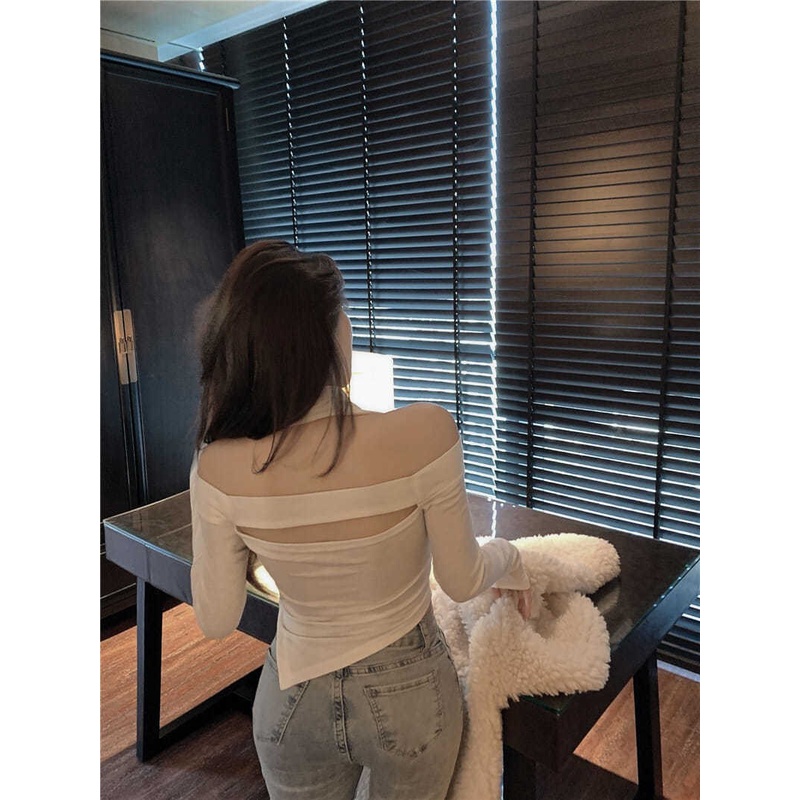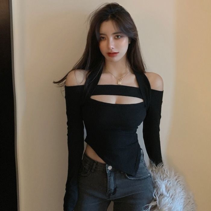 เซ็กซี่เสื้อยืดผู้หญิงหนึ่งไหล่แขนยาวเสื้อยืดการออกแบบที่ไม่สม่ำเสมอสั้นที่ไม่มีสายหนังเซ็กซี่สั้นเสื้อยืด