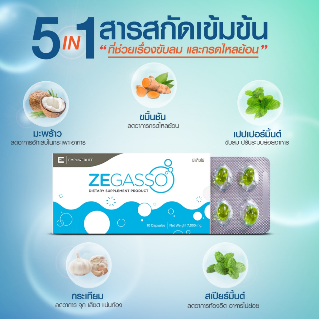 Ze-Gasso สมุน ไพรลดกรดไหลย้อน ขับลม จุกแน่น ช่วยย่อย ท้องอืดแน่นเฟ้อ | 1 แผง 10 แคปซูล [เหมาะสำหรับทดลองใช้]