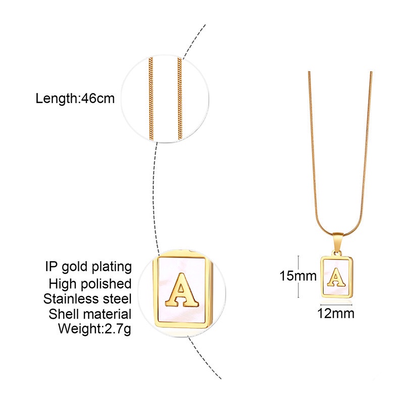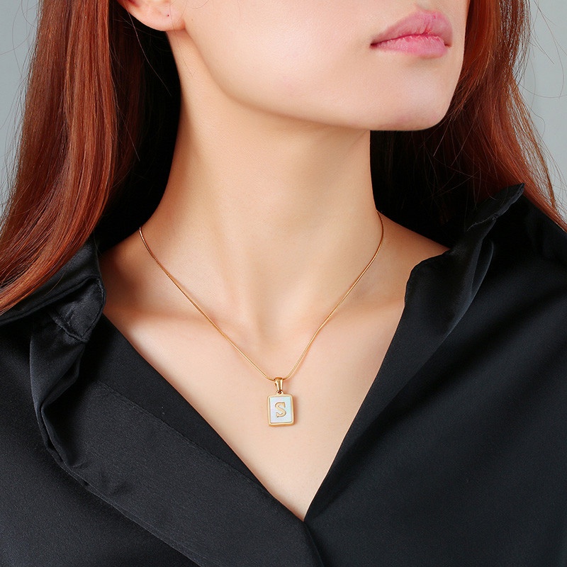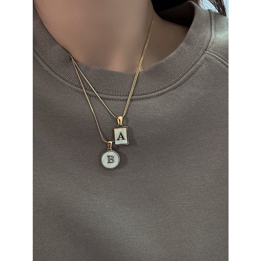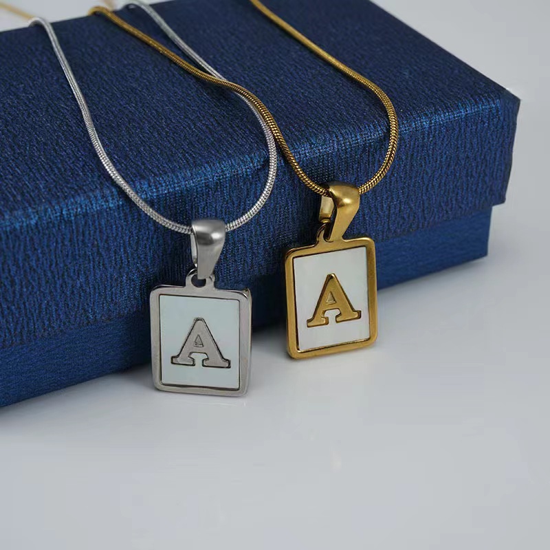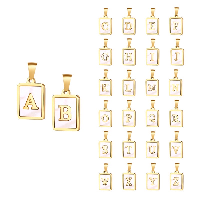 สร้อยคอแสตนเลสสีทองเงางาม พร้อมจี้มุกอักษรอังกฤษสุดแนว