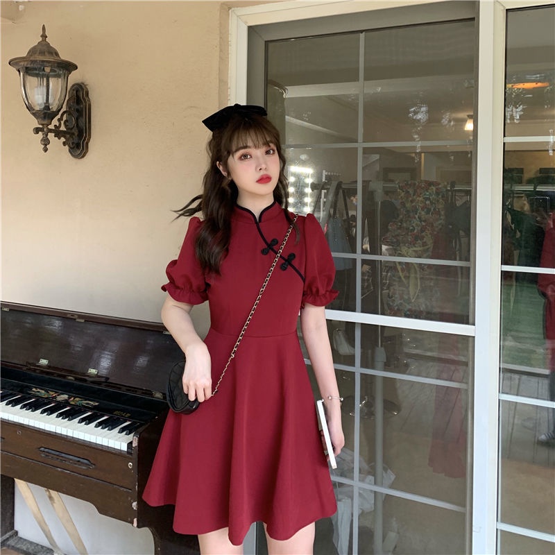 ใหม่ เดรสกี่เพ้าที่ได้รับการปรับปรุง cheongsam ชุดกี่เพ้าสีแดงสไตล์วันตรุษจีน