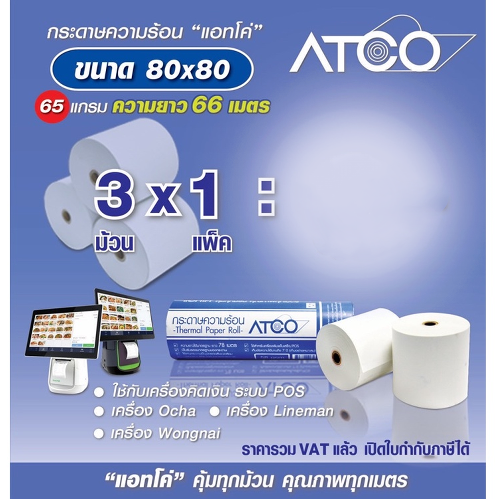 ATCO กระดาษความร้อน สำหรับเครื่องพิมพ์ใบเสร็จ ขนาด 80x80 65แกรม จำนวน3ม้วน