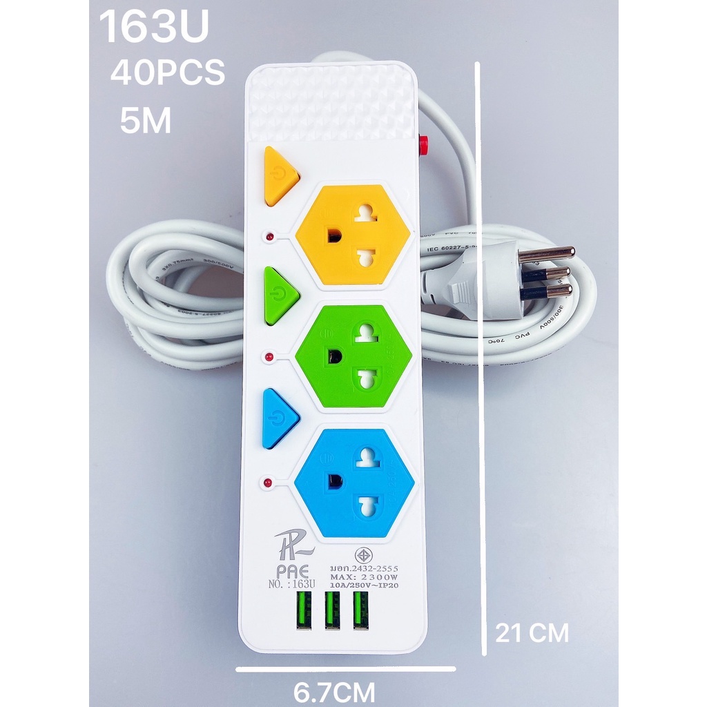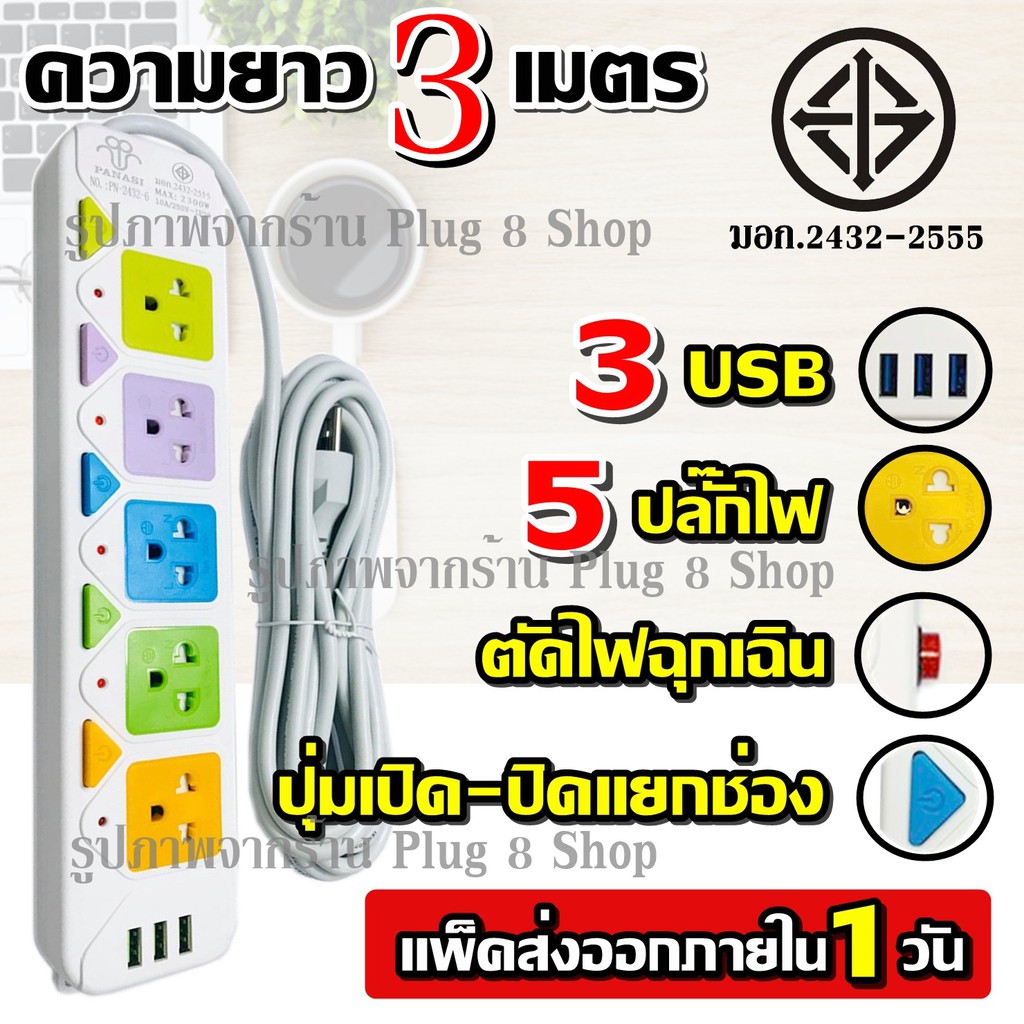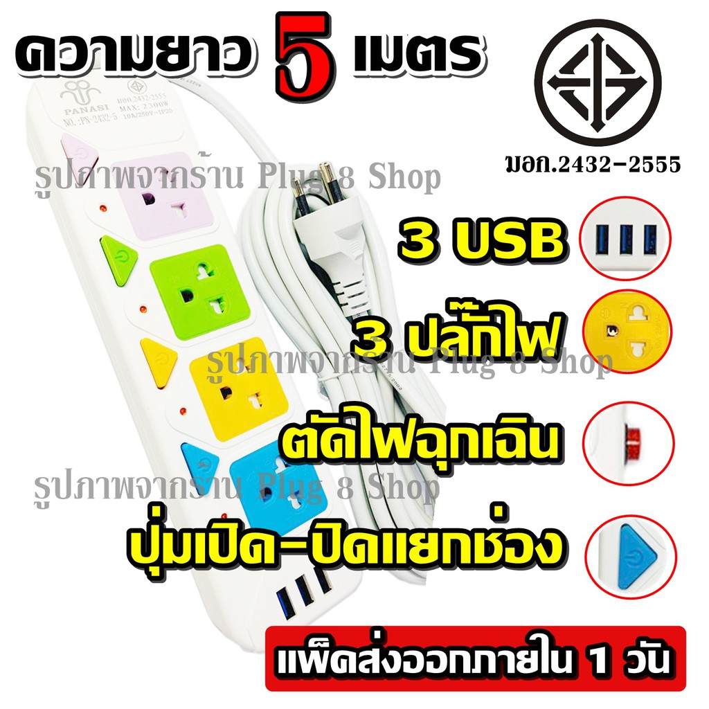PN2432 T545 ปลั๊ก 5ช่อง 4ช่อง 3USB ความยาว 3เมตร / 5เมตร / 8เมตร 2300w สายไฟหนา รางไฟ
