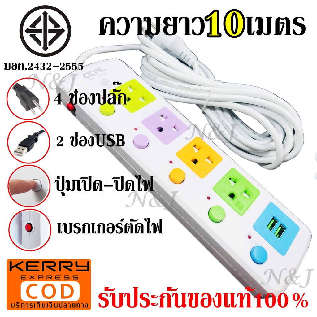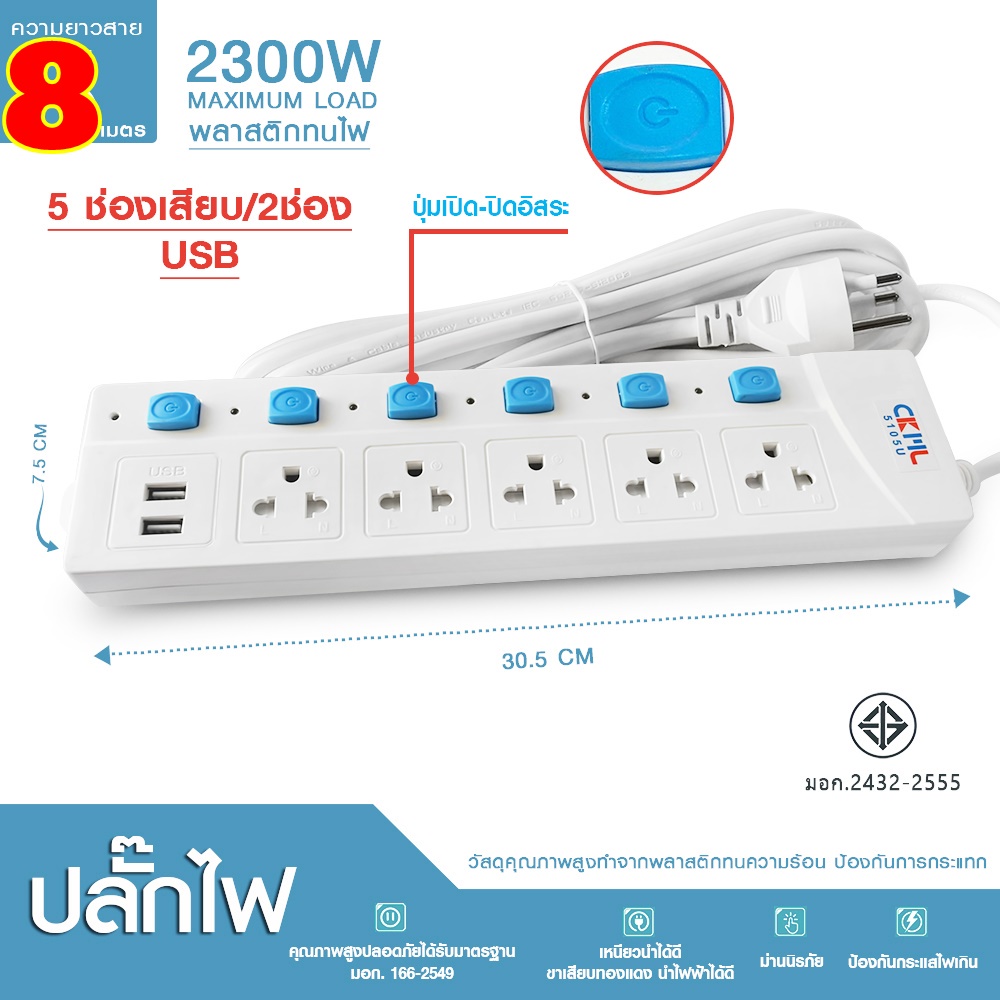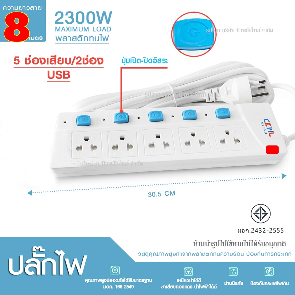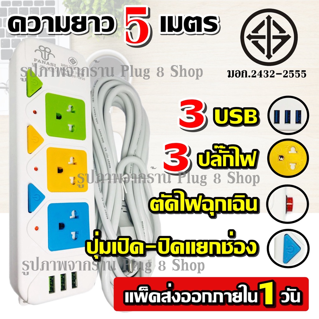 PN2432 T545 ปลั๊ก 5ช่อง 4ช่อง 3USB ความยาว 3เมตร / 5เมตร / 8เมตร 2300w สายไฟหนา รางไฟ