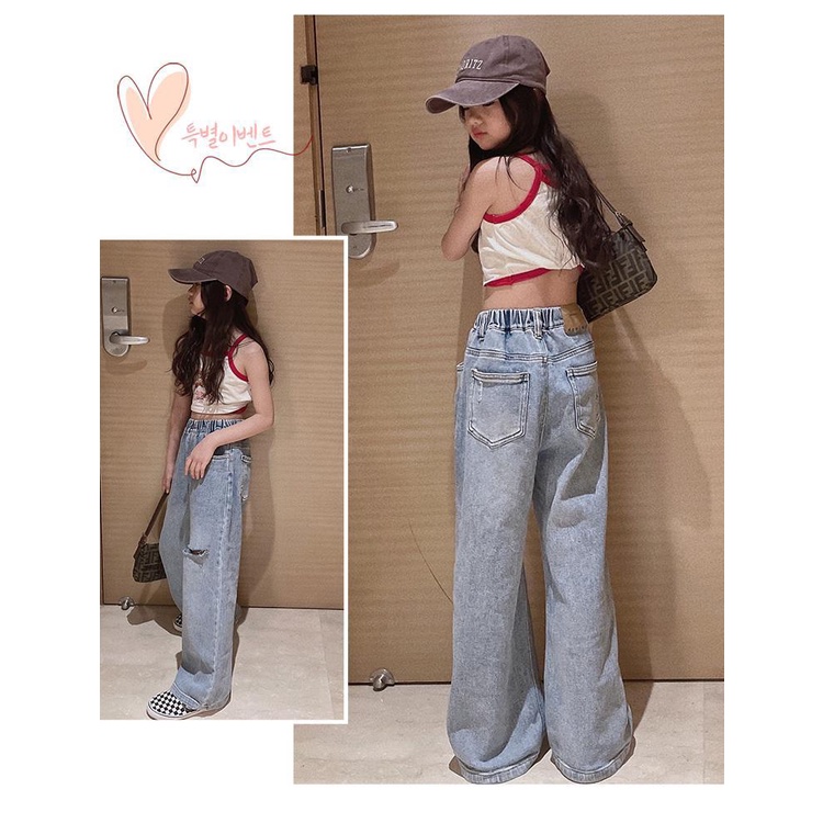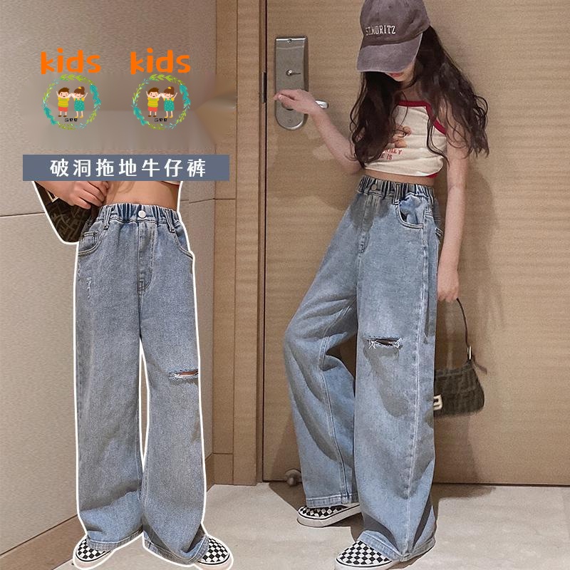 กางเกงยีนขากว้าง แบบขาด สไตล์ใหม่ สําหรับเด็กผู้หญิง อายุ 5 8 10 12 13 15 ปี/977