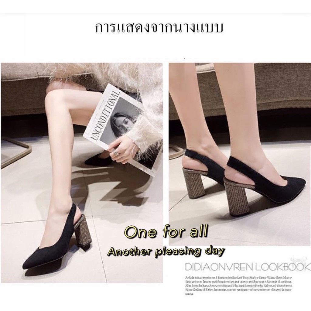 Code"WS26NOS1"ลด25%(26-28Feb)พร้อมส่งTX157รองเท้าส้นสูง รองเท้าส้นหนาติดเพชรคริสตัลปลายแหลมผิวด้าน