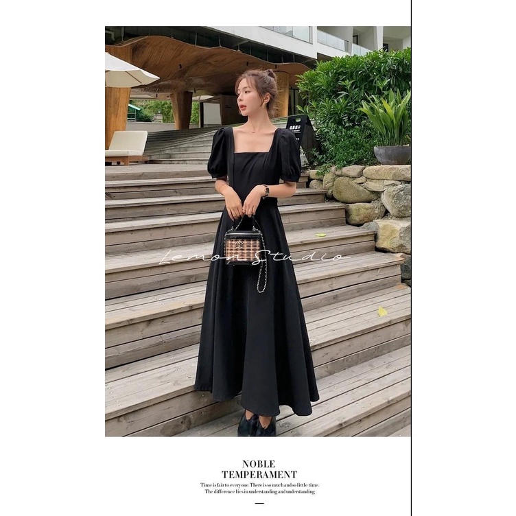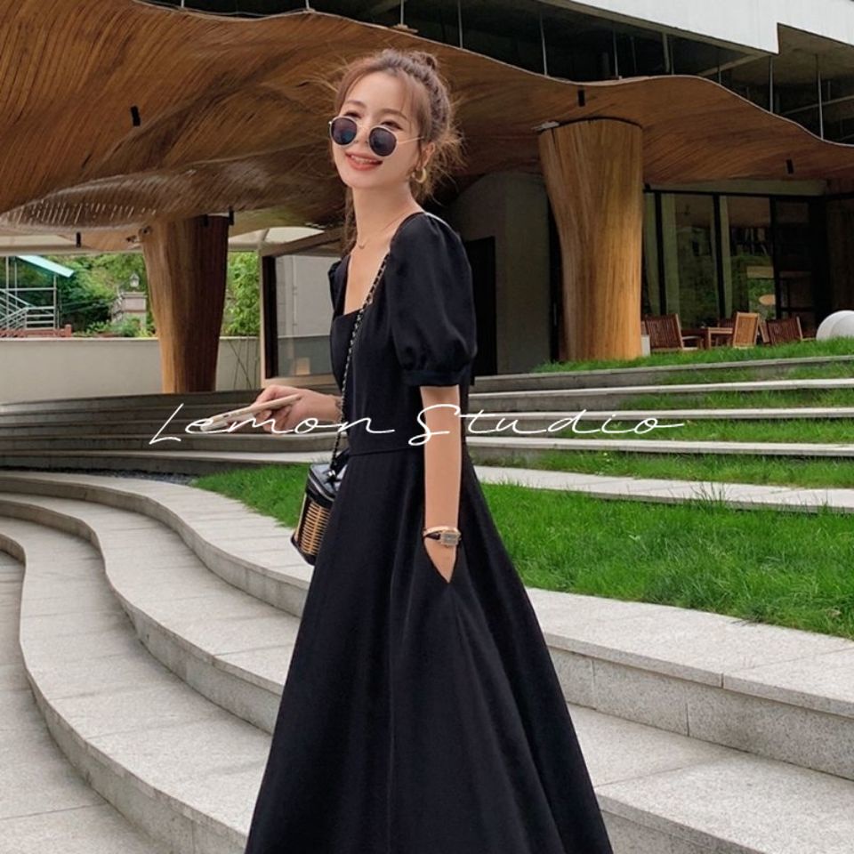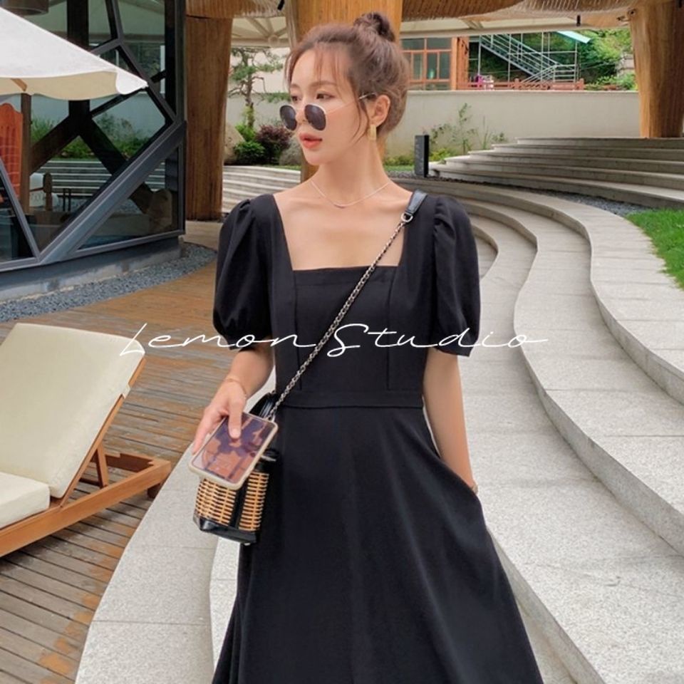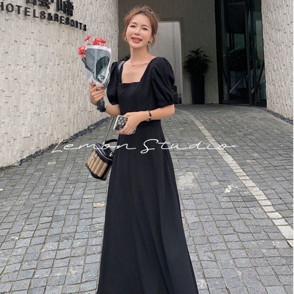 ชุดเดรสแขนยาว ลายเลม่อน สีดํา สไตล์เกาหลี แฟชั่นสําหรับผู้หญิง 720518