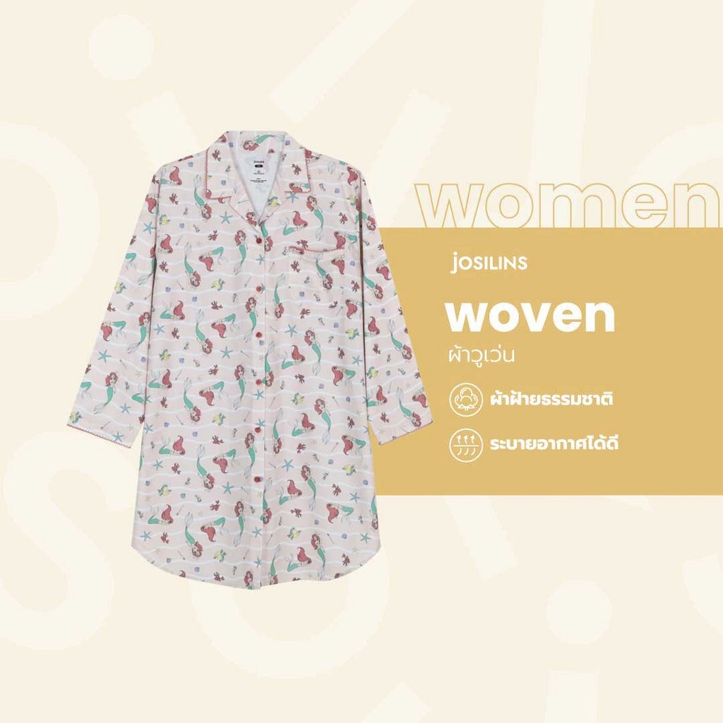Josilins ชุดนอน ผู้หญิง ลิขสิทธิ์ ดิสนีย์ Disney Princess เจ้าหญิง เดรสสั ้น กระโปรงแขนยาว คอปก ผ้าวูเว่น ฟรีไซส์ SM 2025