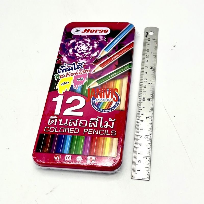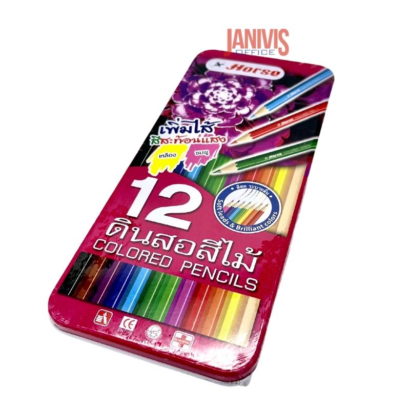 HORSEดินสอสีไม้ยาว กล่องเหล็ก 12 สี ตราม้า สีสด ระบายลื่น เพิ่มสีสะท้อนแสง